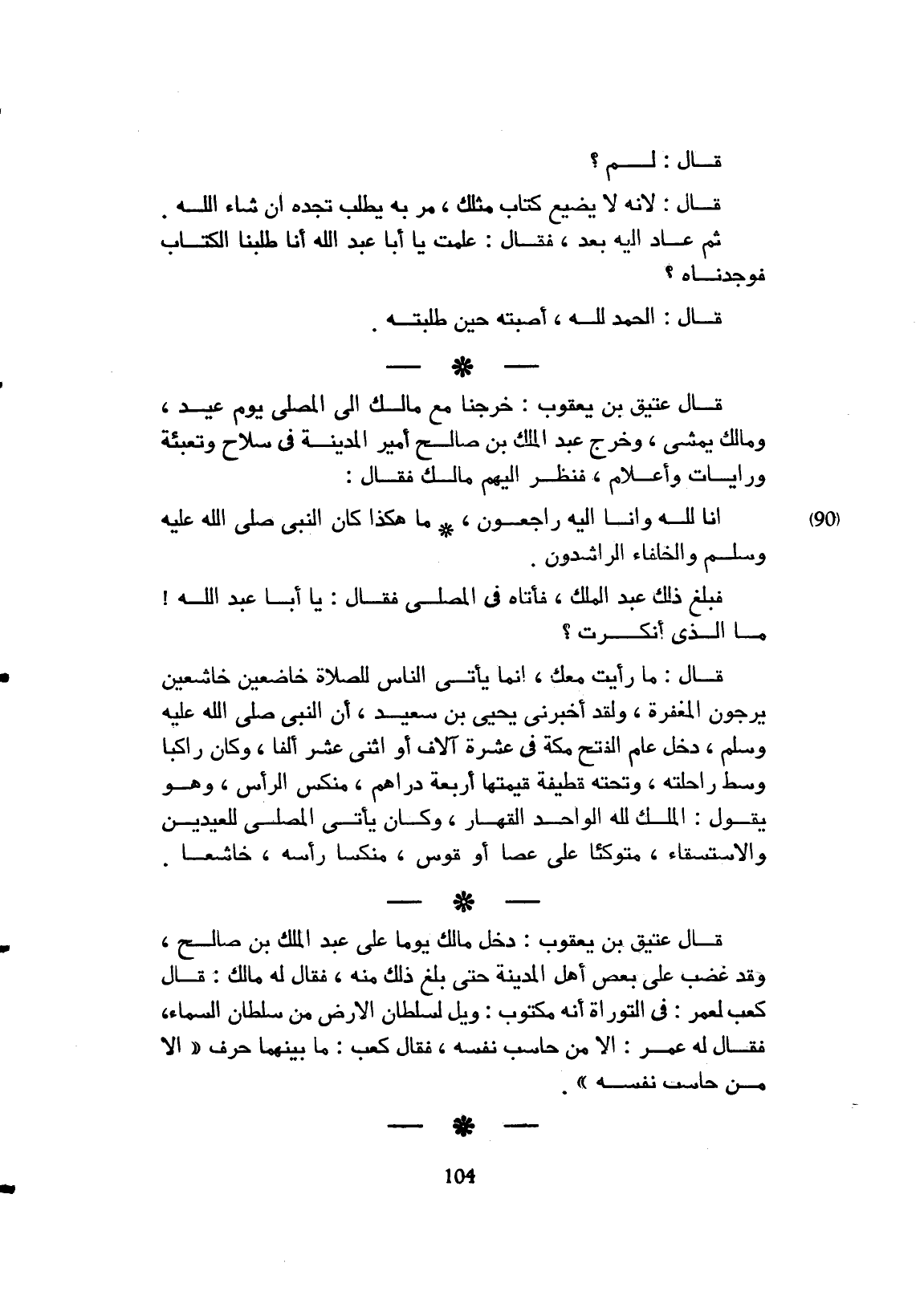 قال عتيق بن يعقوب خرجنا مع مالك إلى المصلى يوم عيد ومالك يمشي، وخرج عبد الملك بن صالح أمير المدينة في سلاح وتعبيه ورايات وأعلام فنظر إليهم مالك فقال إنا لله وإنا إليه راجعون ما هكذا كان النبي صلى الله عليه وسلم والخلفاء الراشدون.