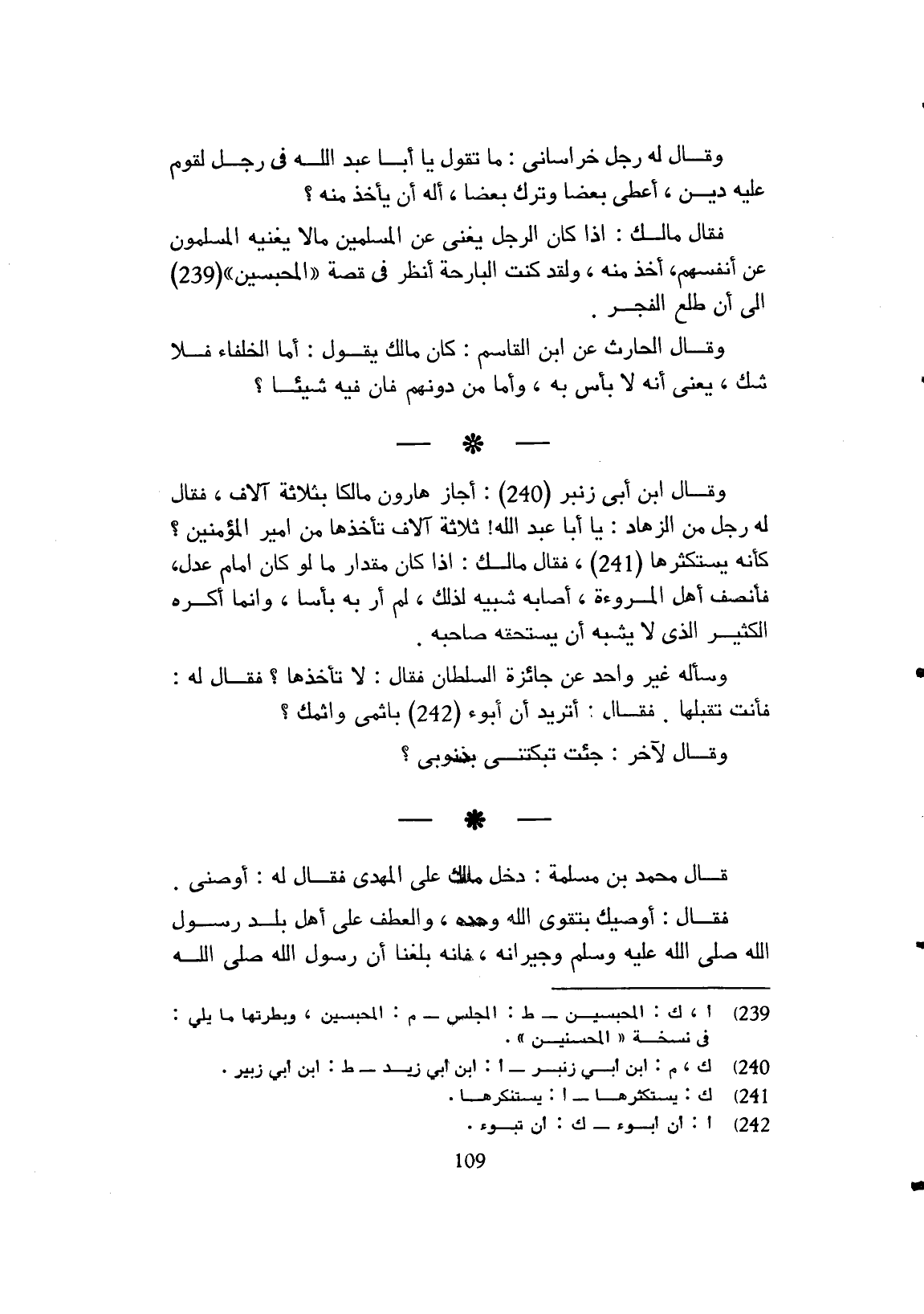 وقال له رجل خراساني ما تقول يا أبا عبد الله في رجل يقوم عليه ديناً أعطى بعضاً وترك بعضاً أله أن يأخذ منه؟ فقال مالك إذا كان الرجل يغني عن المسلمين ما لا يغنيه المسلمون عن نفسه أخذ منه، ولقد كنت أنظر البارحة في قصة المحبين إلى أن طلع الفجر.