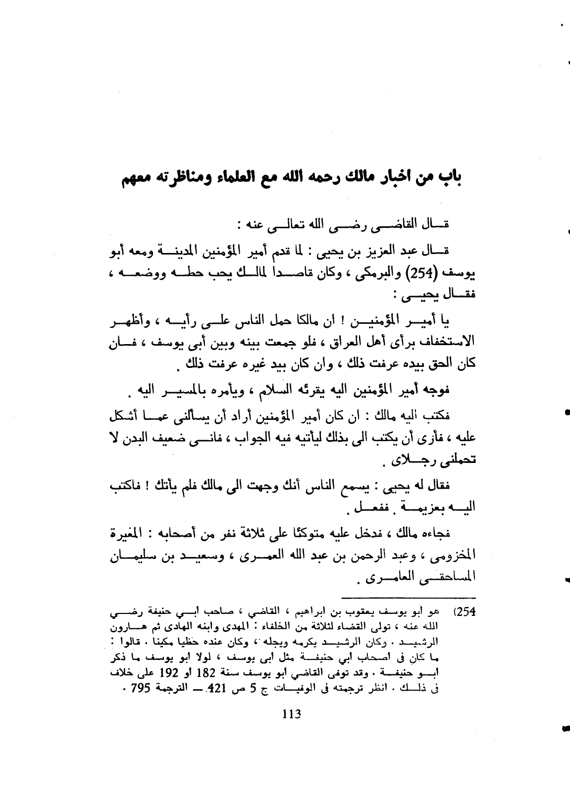قال القاضي رضي الله تعالى عنه: قال عبد العزيز بن يحيى لما قدم أمير المؤمنين المدينة ومعه أبو يوسف والبرمكي وكان قاضياً، لمالك (كذا) يحب خطه ووقعه.