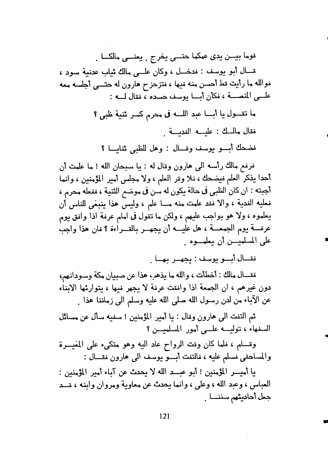فضحك أبو يوسف وقال: وهل للظبي ثنايا؟ فرفع مالك رأسه إلى هارون وقال له يا سبحان الله ما علمت أن أحداً يذكر العلم فيضحك.