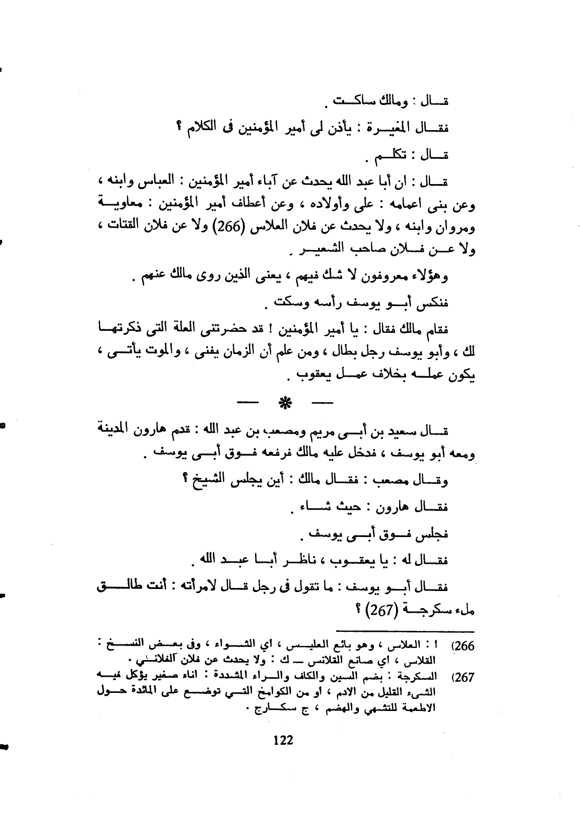 وقال مصعب: فقال مالك أين يجلس الشيخ فقال هارون حيث شاء فجلس فوق أبي يوسف.