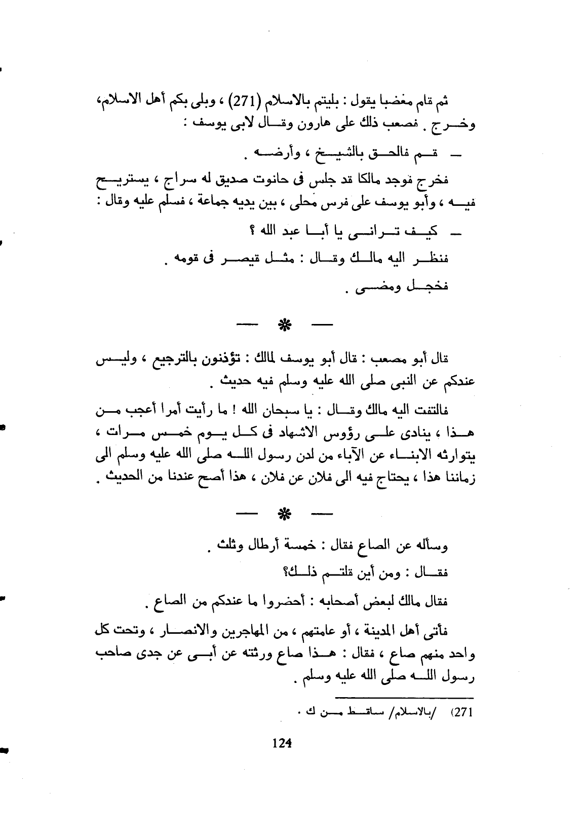فصعب ذلك على هارون وقال لأبي يوسف قم والحق الشيخ وارضه وخرج فوجد مالكاً قد جلس في حانوت صديق له سراج يستريح فيه ابو يوسف على فرس فحل بين يديه، وقال كيف تراني يا أبا عبد الله فنظر إليه وقال مثل قيصر في قومه.