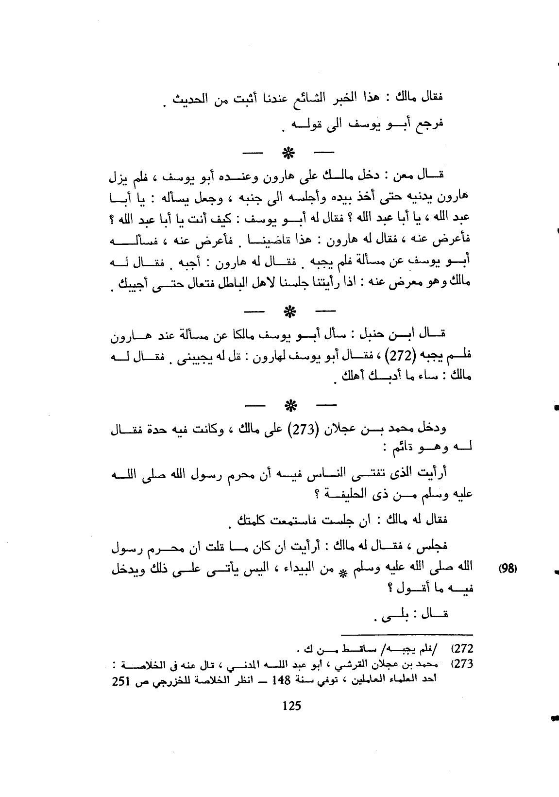 قال ابن حنبل: سأل أبو يوسف مالكاً عن مسألة عند هارون، فقال أبو يوسف لهارون قل له يجبني.