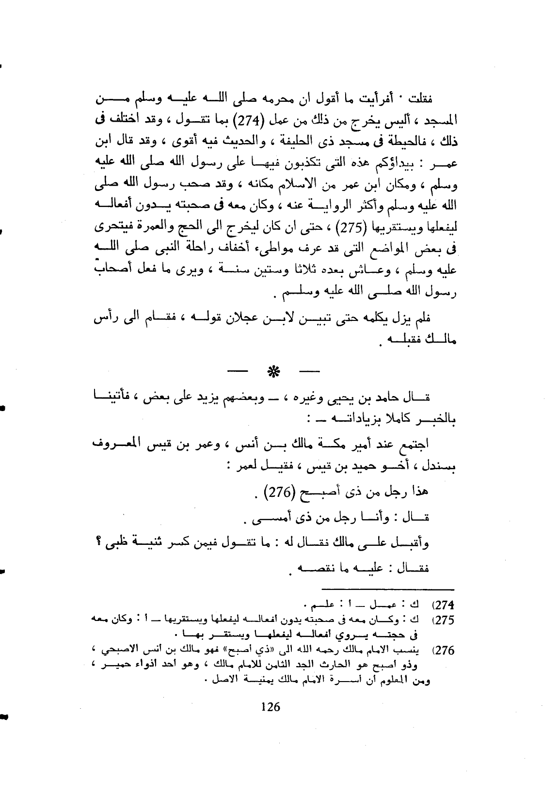 فقلت أفرأيت ما أقول إن محرمه صلى الله عليه وسلم من المسجد أليس يخرج من ذلك من عمل بما تقول، وقد اختلف في ذلك؟ فالحيطة في مسجد ذي الحليفة والحديث فيه أقوى، وقد قال ابن عمر بيداؤكم هذه التي تكذبون فيها على رسول الله صلى الله عليه وسلم وأكثر الرواية عنه وكان معه في صحبته يدون أفعاله ليفعلها ويستقريها حتى إن كان ليخرج إلأى الحج والعمرة فيتحرى في بعض المواضع التي عرف مواطىء أخفاف راحلة النبي صلى الله عليه وسلم، وعاش بعده ثلاثاً وستين سنة، ويرى ما فعل أصحاب رسول الله صلى الله عليه وسلم.