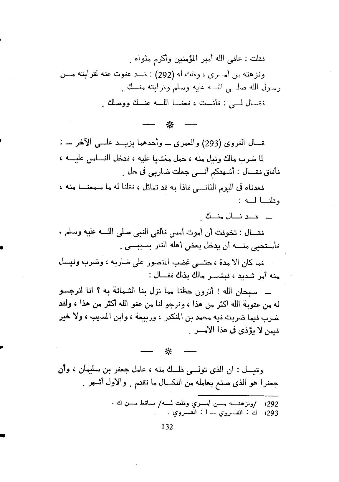 فقال تخوفت أن أموت أمس فألقى النبي صلى الله عليه وسلم فأستحي منه أن يدخل بعض آله النار بسببي فما كان إلا مدة حتى غضب المنصور على ضاربه وضرب ونيل منه أمر شديد.