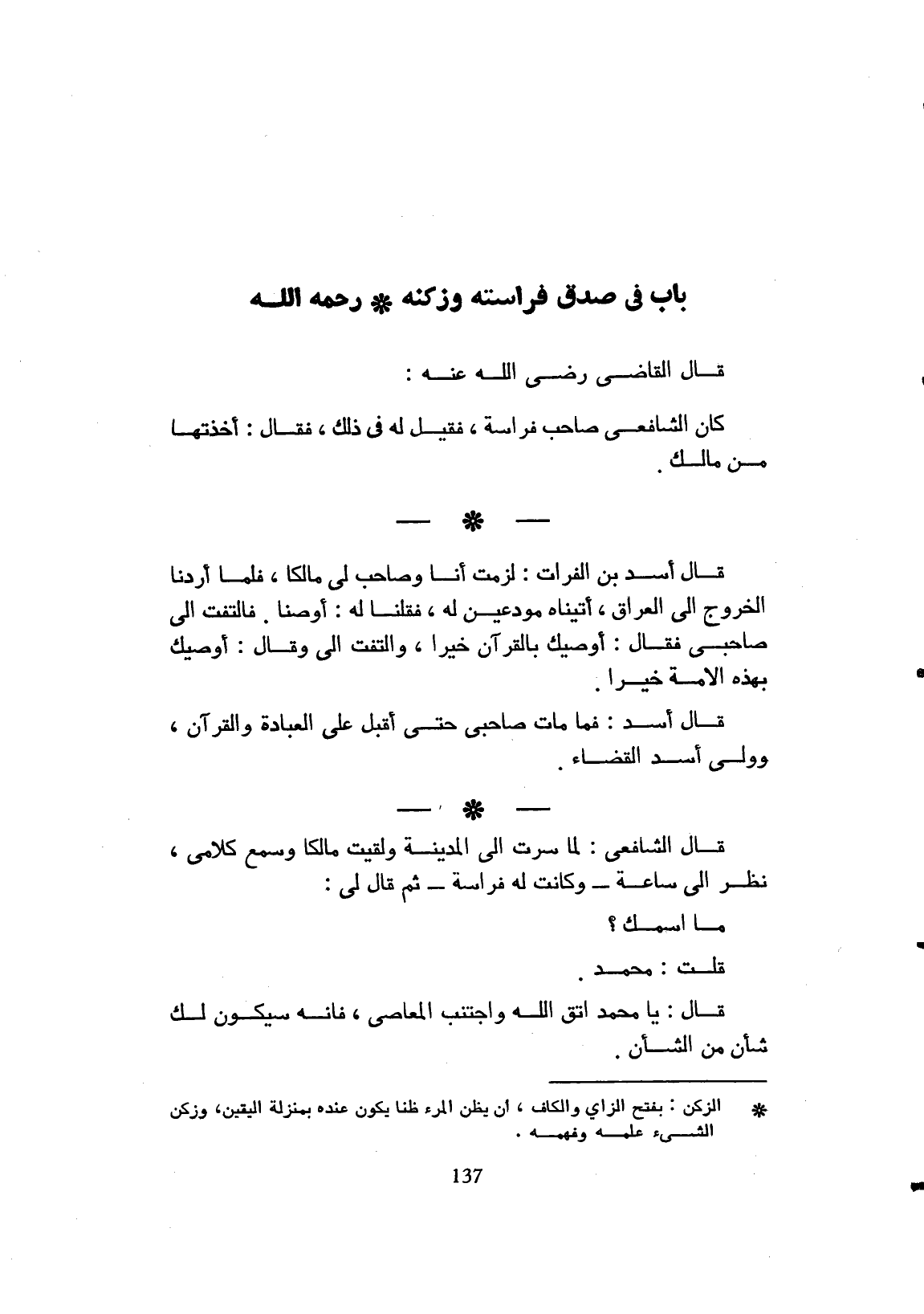 قال القاضي رضي الله تعالى عنه: كان الشافعي صاحب فراسة، فقيل له في ذلك، فقال: أخذتها من مالك.