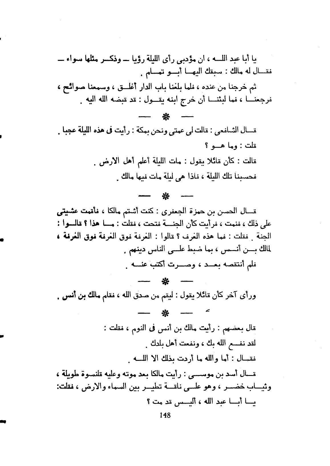 قال أسد بن موسى: رأيت مالك بن أنس بعد موته وعليه طويلة وثياب خضر، وهو على ناقة تطير بين السماء والأرض، فقلت: يا أبا عبد الله، أليس قدمت؟