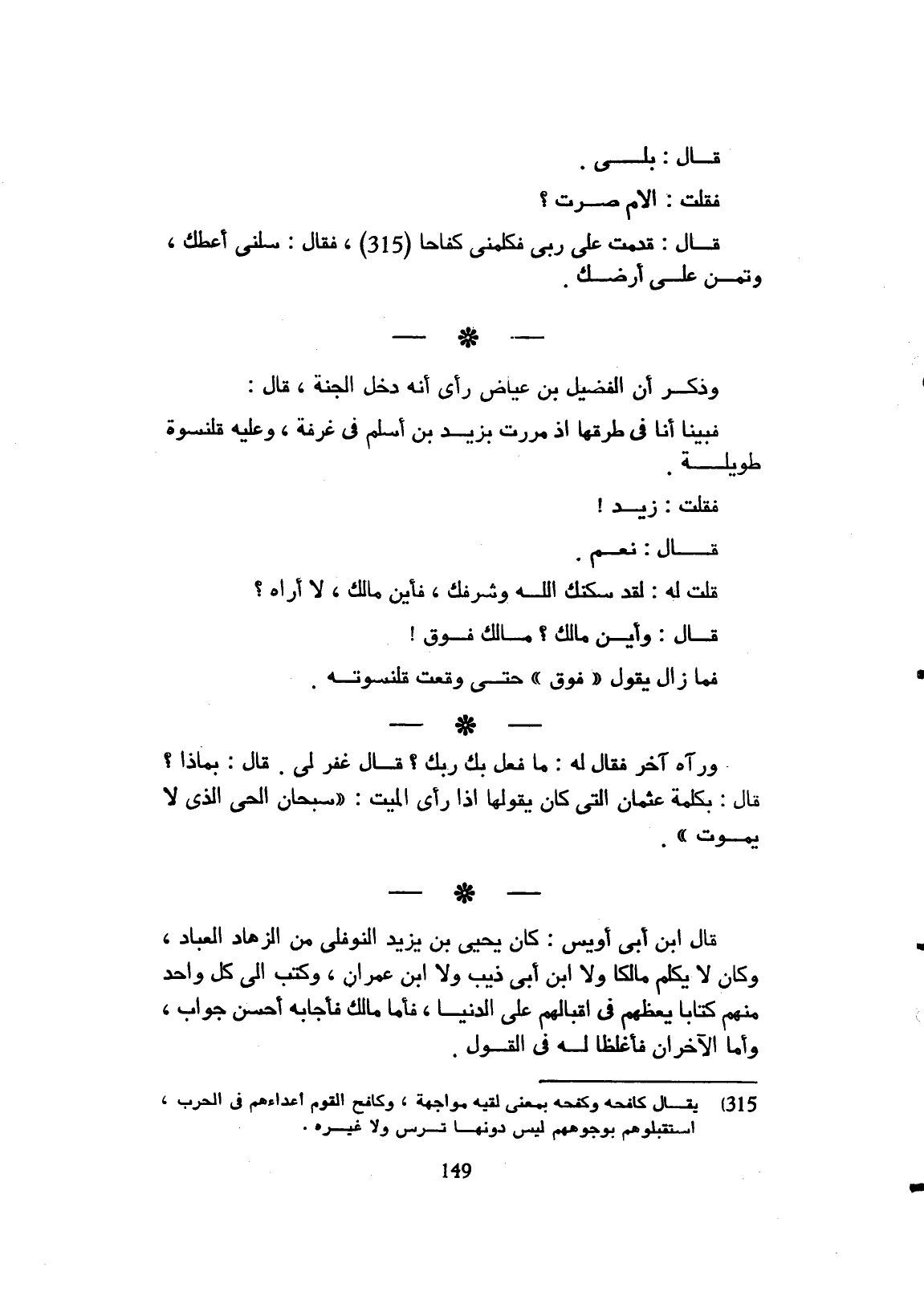 فقلت فإلى ما صرت؟ قال قدمت على ربي فكلمني كفاحاً، قال: سلني أعطيك، وتمن علي أرضيك.