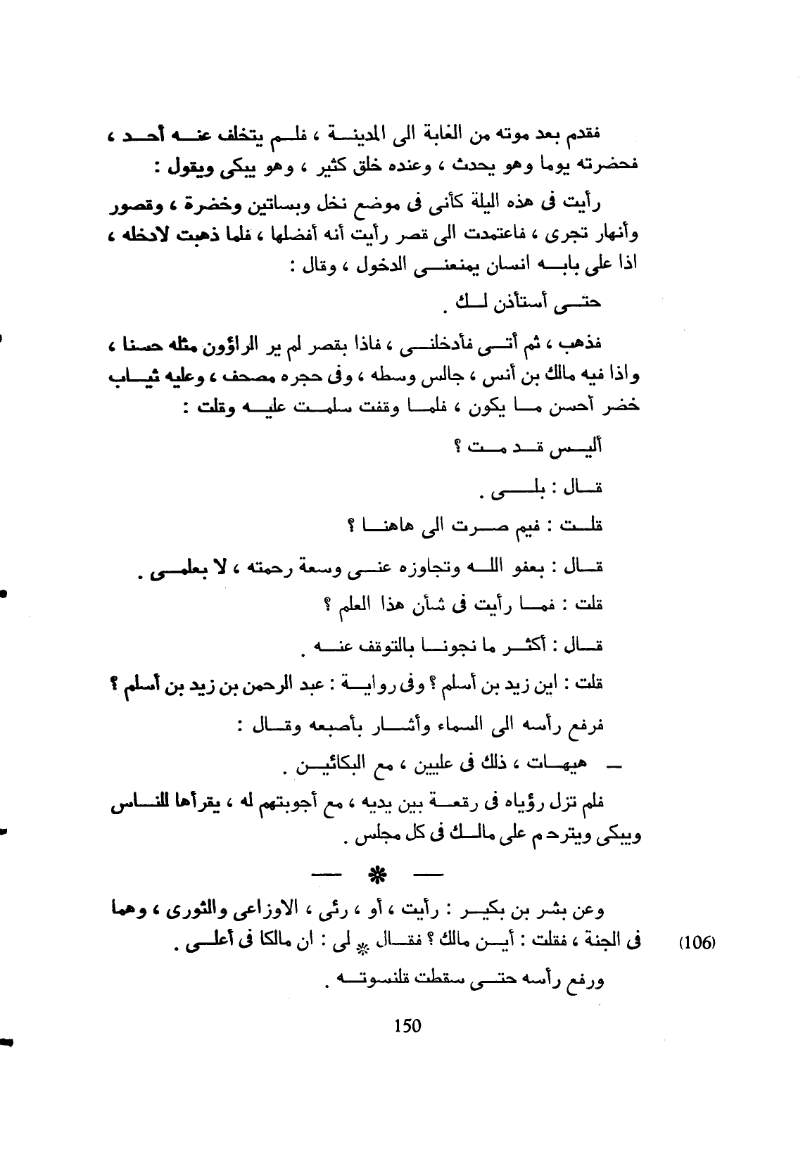 وعن بشير بن بكر: رأيت أو رأى الأوزاعي والثوري وهما في الجنة، فقلت أين مالك؟ فقال لي: إن مالكاً في أعلى ورفع رأسه حتى سقطت قلنسوته.