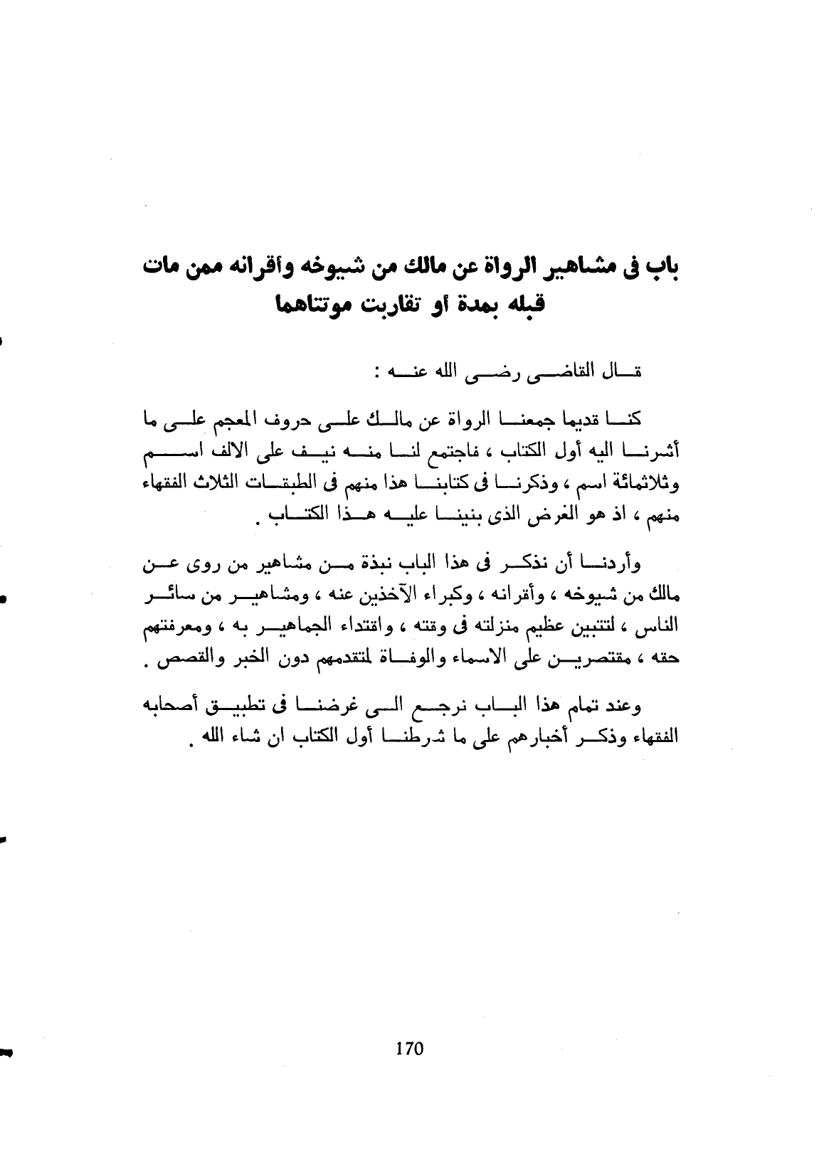 قال القاضي رضي الله عنه: كنا قديماً جمعنا الرواة عن مالك على حروف المعجم، على ما أشرنا إليه أول الكتاب، فاجتمع لنا منه نيف على الألف اسم وثلاثمائة اسم، وذكرنا في كتابنا هذا منهم في الطبقات الثلاثة الفقهاء منهم، إذ هو الغرض الذي بيننا عليه هذا الكتاب، وأردنا أن نذكر في هذا الباب نبذة من مشاهير من روى عن مالك من شيوخه وأقرانه، وكبراء الآخذين عنه، ومشاهير من سائر الناس ليتبين عظيم منزلته في وقته، واقتداء الجماهير به ومعرفتهم حقه، مقتصرين على الأسماء والوفاة لتقدمهم دون الخبر والقصص وعند تمام هذا الباب نرجع إلى غرضنا في تطبيق أصحابه الفقهاء وذكر أخبارهم على ما شرطنا أول الكتاب.