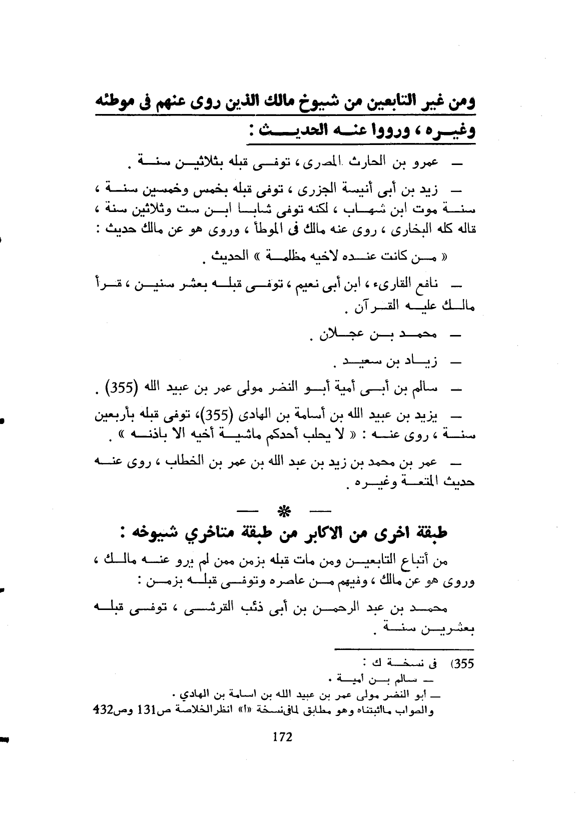 ومن غير التابعين من شيوخ مالك الذين روى عنهم وغيره ورووا عنه الحديث، عمر بن الحارث المصري توفى قبله بثلاثين سنة.