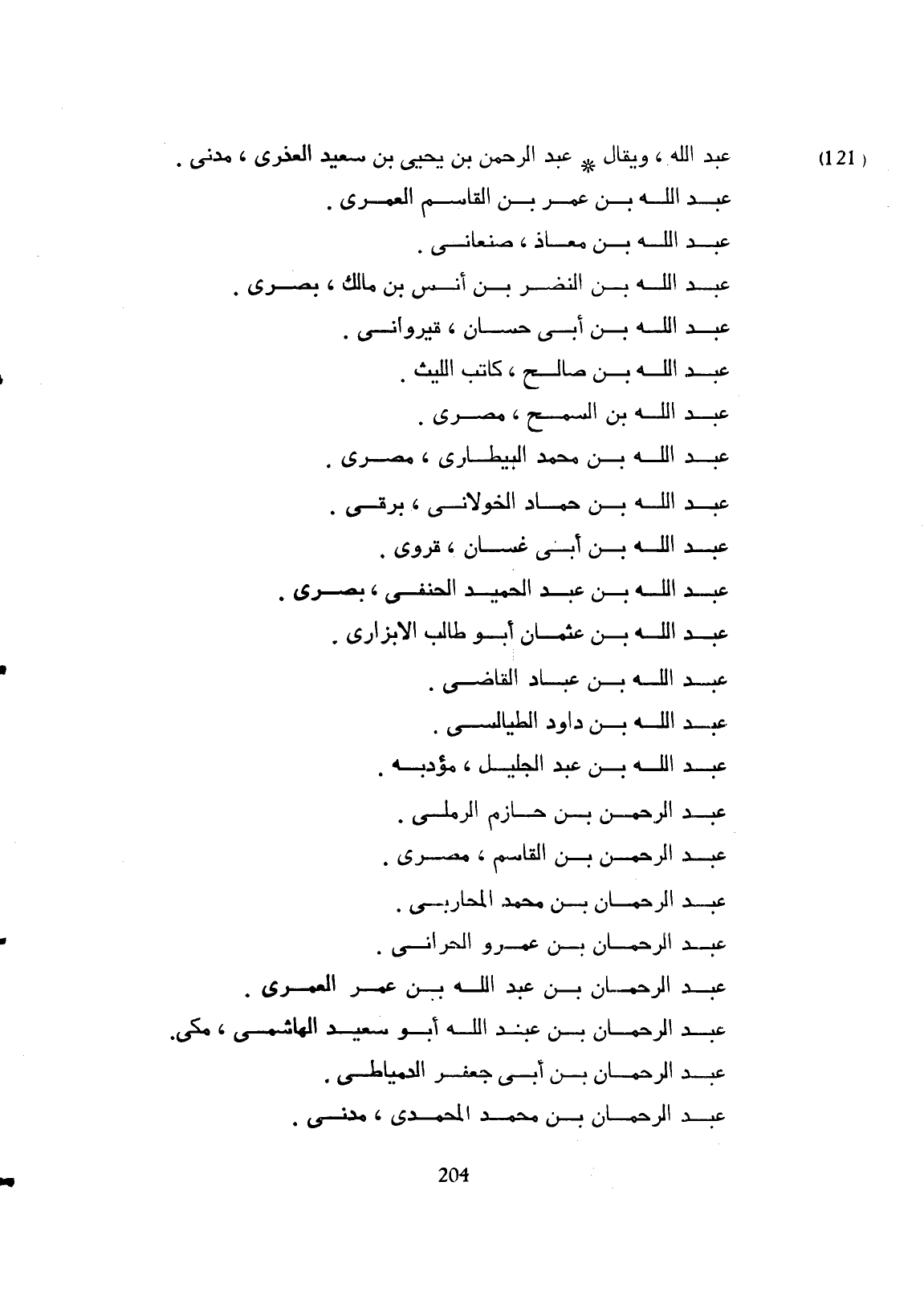 عبد الله ويقال عبد الرحمان بن يحيى بن سعيد القدري مدني. عبد الله بن عمر بن قاسم العمري. عبد الله بن معاذ صنعائي. عبد الله بن النضر بن أنس بن مالك بصري. عبد الله بن أبي حسان قيرواني. عبد الله بن صالح كاتب الليث. عبد الله بن أسمح مصري. عبد الله بن محمد البيطاري مصري. عبد الله بن حماد الخولاني مدني. عبد الله بن أبي غسان قروي. عبد الله ابن عبد الحميد الحنفي بصري. عبد الله بن عثمان أبو طالب الإبزاري. عبد الله بن عياد القلزومي. عبد الله بن داود الطيالسي. عبد الله بن عبد الجليل مؤدبه. عبد الله بن حازم الرملي. عبد الرحمان بن القاسم مصري. عبد الرحمان بن محمد المحاربي. عبد الرحمان بن عمر الحراني. عبد الرحمان ابن عبد الله بن عمر العمري. عبد الرحمان بن عبد الله أبو سعيد الهاشمي مكي. عبد الرحمان بن أبي جعفر الدمياطي. عبد الرحمان بن عبد الله ابو سعيد الهاشمي مكي.