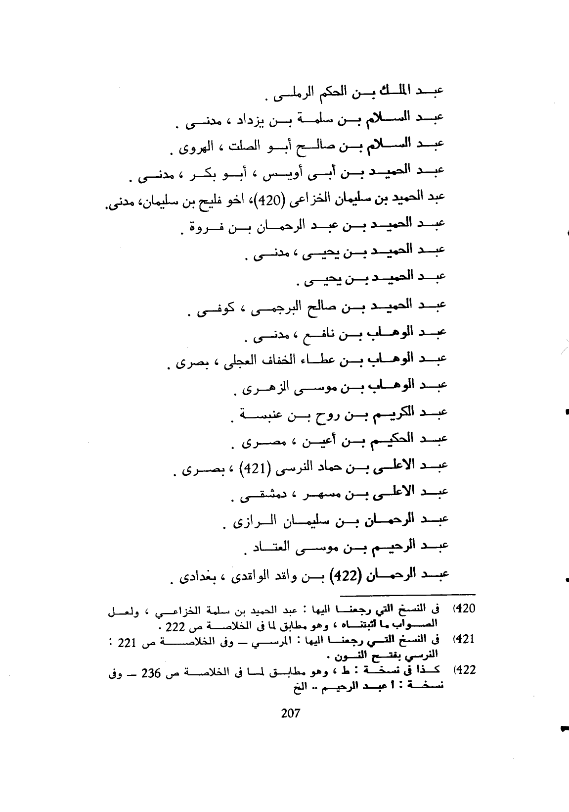 عبد الملك بن الحكم الرملي. عبد السلام بن سلمة بن يرداد مدني. عبد السلام بن صالح أبو الصلق الهروي. عبد الحميد بن أبي أويس أبو بكر مدني. عبد الحميد ابن سليمان الخزاعي أخو فليح بن سليمان مدني. عبد الحميد بن عبد الرحمان ابن فروة. عبد الحميد بن يحيى مدني. عبد الحميد بن صالح البرجمي كوفي. عبد الوهاب بن نافع مدني. عبد الوهاب بن عطارد الخفاف العجلي بصري. عبد الوهاب بن موسى الزهري. عبد الكريم بن روح بن عنبسة. عبد الحكم ابن أعين مصري. عبد الأعلى بن حماد الراسبي بصري. عبد الأولى بن مسهر دمشقي. عبد الرحيم بن موسى العتاد. عبد الرحيم بن واقد بغدادي.