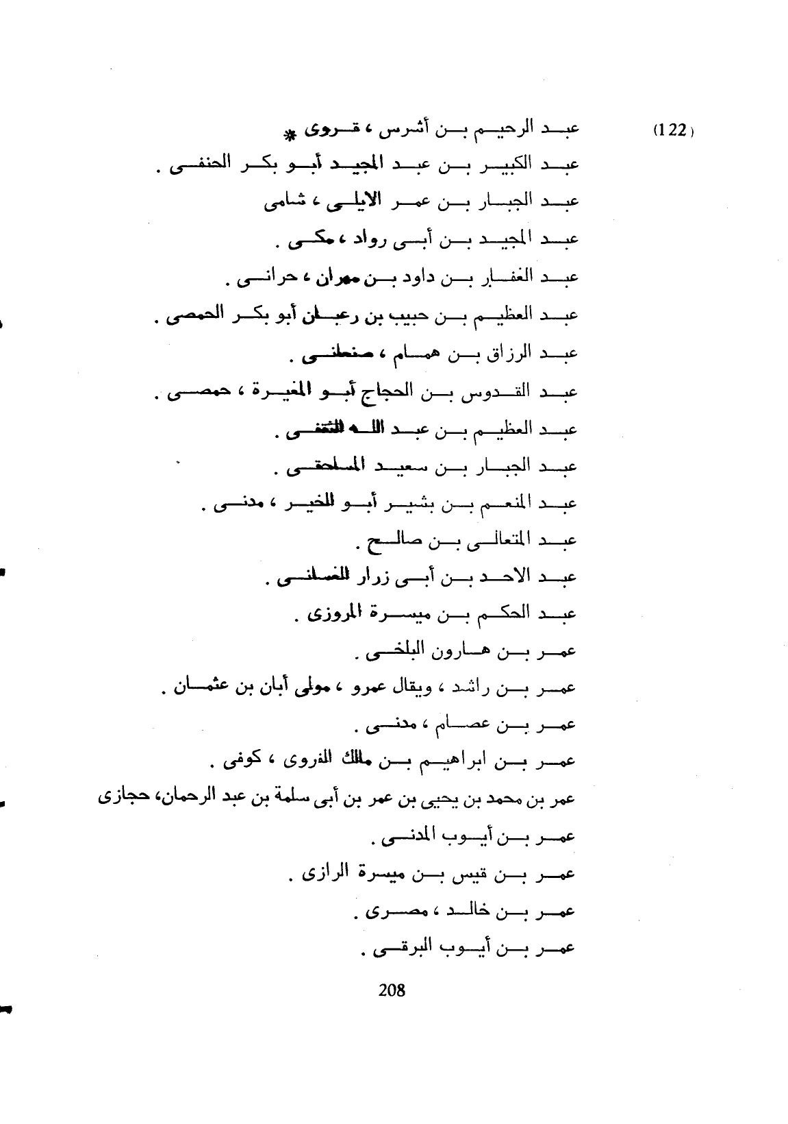 عبد الرحيم بن أشرس قروي. عبد الكبير بن عبد الحميد بن أبي رواد مكي. عبد الغفار ب داود بن مهران حراني. عبد العظيم بن حبيب بن زغبان أبو بكر الحمصي. عبد الرزاق بن همام صنعائي. عبد الجليل بن سعيد الساحقي. عبد المنعم بن بشر أبو الخير مدني. عبد المتعال بن صالح. عبد الأحد بن أبي زرارة الغساني. عبد القدوس بن الحجاج أبو المغيرة حمصي. عبد العظيم ابن عبد ابن عبد الله النقعي. عبد الحكم بن ميسرة المروزي. عمر بن هارون البلخي. عمر بن راشد ويقال عمرو الرملي. عمر بن أبان بن عثمان. عمر بن عصام مدني. عمر ابن إبراهيم بن مالك الكردي كوفي. عمر بن محمد بن يحيى ابن عمر بن أبي مسلمة بن عبد الرحمان حجازي. عمر بن أيوب المدني. عمر بن نعيم بن ميسرة الرازي. عمر بن خالد مصري. عمر بن أيوب البرقي.