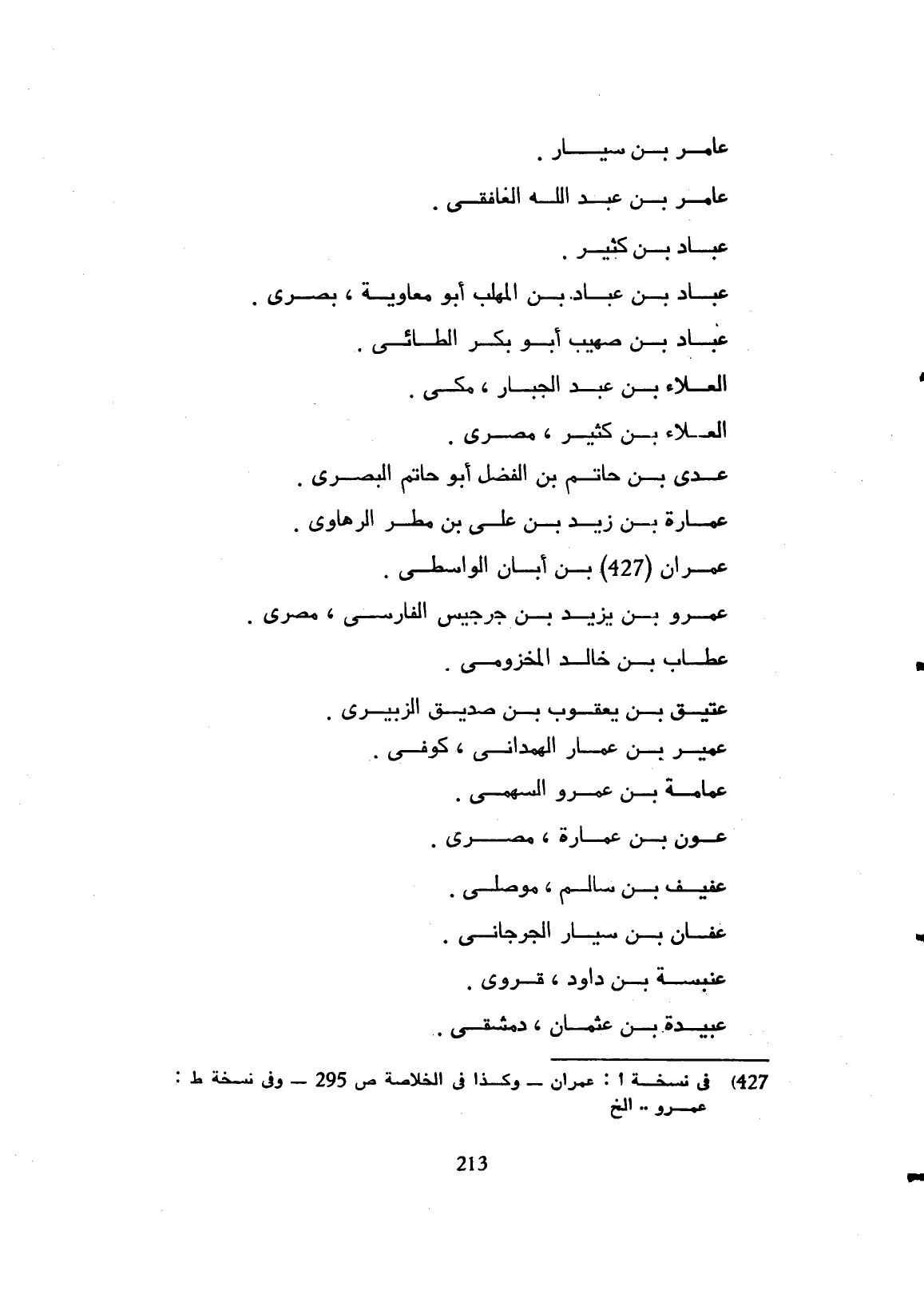عامر بن يسار. عامر بن عبد الله الغافقي. عباد ابن كثير عباد بن عباد بن المهلب أبو معاوية بصري. عباد بن صهيب أبو بكر الكلبي. العلاء بن عبد الجبار مكي. العلاء بن كثير مصري. علي ابن الفضل أبو حاتم البصري. عمارة بن زيد. علي بن مطر الرهاوي. عمران ابن أبان الواسطي. عمر بن يزيد بن جرجيس الفارسي مصري. عطاف بن خالد المخزومي.