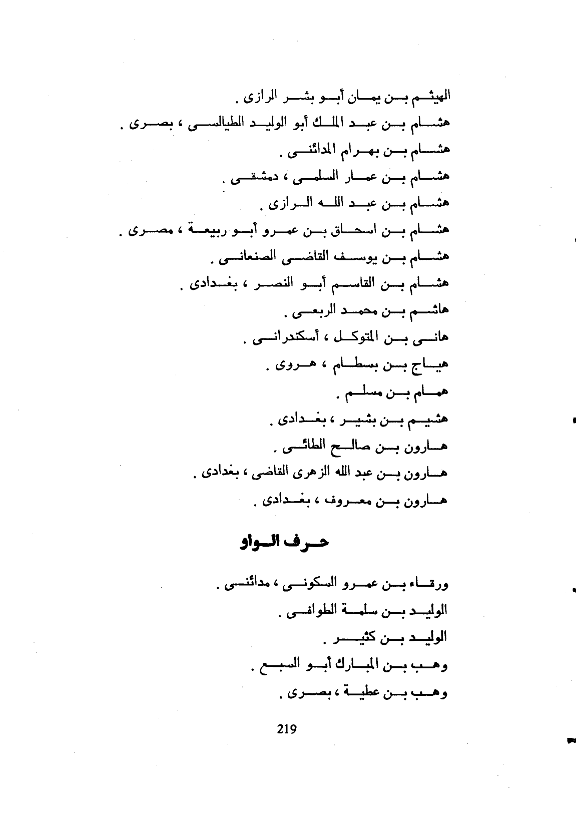 الهيثم بن حيان ابو بشر الرازي. هشام بن عبد الملك المدائني. أبو الوليد الطيالسي بصري. هشام ابن بهرام المدائني. هشام بن عمار السلمي دمشقي. هشام بن عبد الله الرازي. هشام بن إسحاق بن عمرو أبو ربيعة مصري. هشام بن يوسف القاضي الصنعاني. هاشم بن القاسم أبو النضر بغدادي. هشام بن محمد الربعي. هانىء بن المتوكل اسكندراني. هياج بن بسطام هروي. هشام بن مسلم. هشيم بن بشير بغدادي. هارون بن صالح الطائي. هارون بن أبي الهيدام. هارون بن عبد الله الزهري القاضي بغدادي. هارون بن معروف بغدادي.