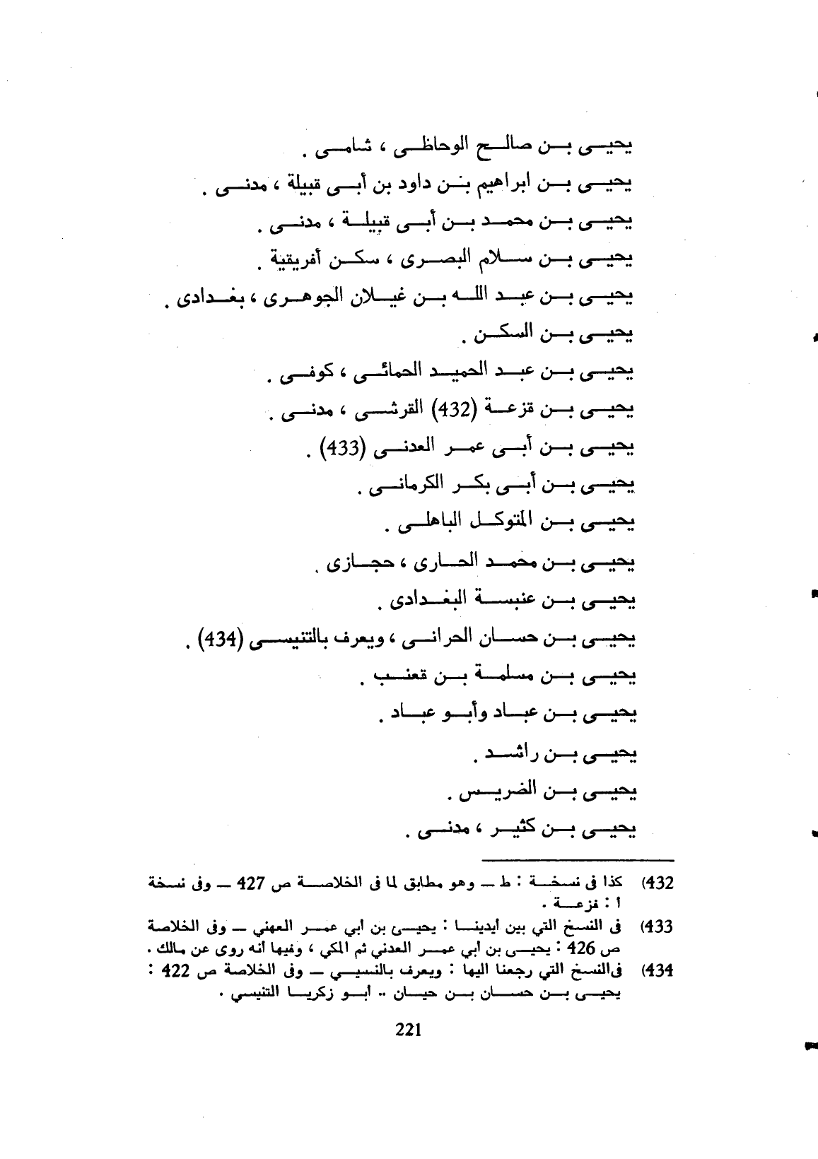 يحيى بن صالح الوحاظي شامي. يحيى بن إبراهيم بن داود بن أبي قتيبة مدني. يحيى بن محمد بن قتيبة مدني. يحيى بن سالم البصري، سكن أفريقية. يحيى بن عبد الله بن غيلان الجوهري بغدادي. يحيى بن السكن. يحيى بن عبد الحميد الحمامي كوفي. يحيى بن ترعة القرشي مدني. يحيى بن أبي عمر المدني. يحيى بن أبي المتوكل الباهلي. الحراني ويعرف ويعرف بالتميمي. يحيى بن مسلمة بن قعنب. يحيى بن أبي عباد. يحيى بن راشد. يحيى بن الضريس
