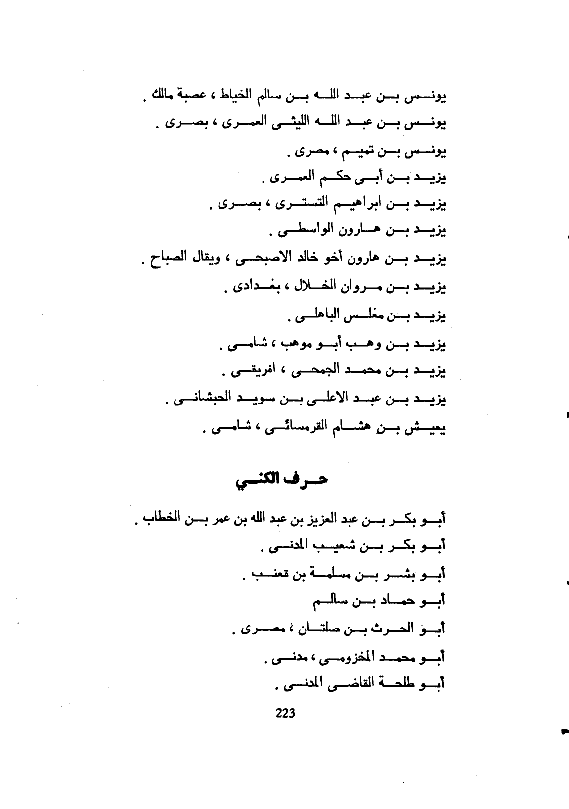 يونس بن عبد الله بن سالم الخياط عصبة مالك. يونس بن عبد الله الليثي لعمري بصري. يونس بن تميم مصري. يزيد بن أبي حكيم المدني. يزيد بن إبراهيم التستري. يزيد بن هارون الواسطي. يزيد بن هارون أبو خالد الأصبحي ويقال الصباحي. يزيد بن الخلال بغدادي. يزيد بن مغلس الباهلي. يزيد بن وهب أبو موهب شافعي. يزيد بن محمد الجمحي أفريقي. يزيد بن عبد الأعلى ابن سويد الحبشاني. يعيش بن هشام القرقساني شامي.