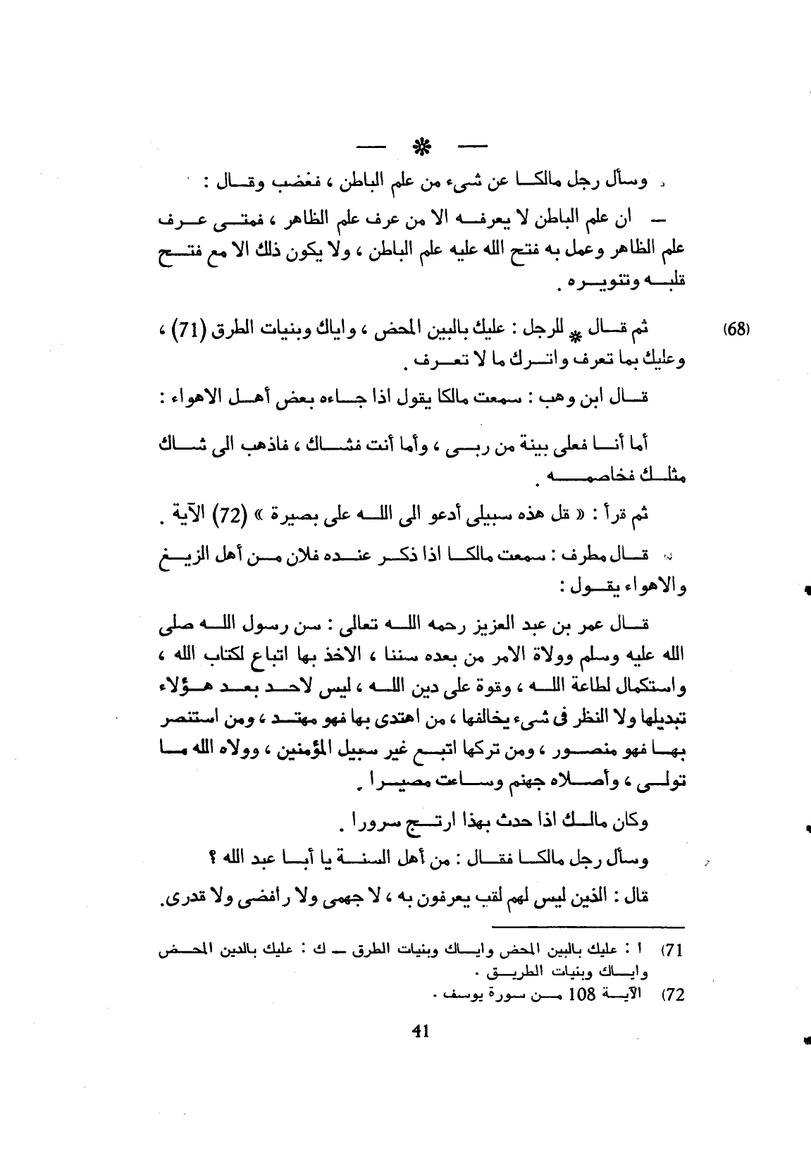 وكان مالك إذا حدث بهذا ارتج سروراً، وسأل رجل مالكاً من أهل السنة يا أبا عبد الله؟ قال: الذين ليس لهم لقب يعرفون به، لا جهمي ولا رافضي ولا قدري.