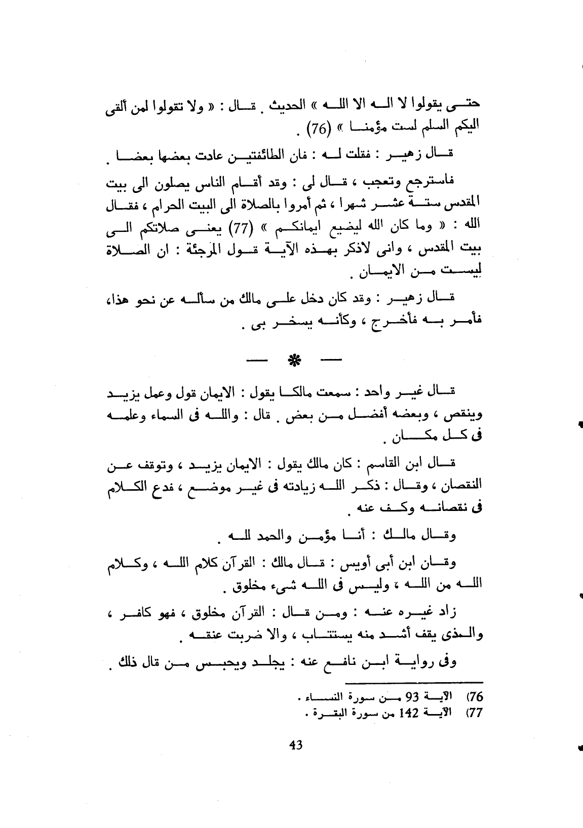 قال زهير وقد كان دخل على مالك من سأله عن نحو هذا فأمر به فأخرج وكأنه لمخزياً قال غير واحد سمعت مالكاً يقول الإيمان قول وعمل وينقص وبعضه أفضل من بعض.