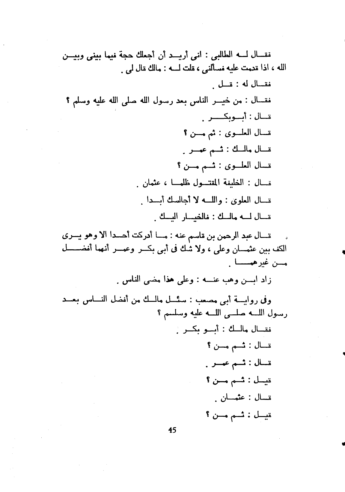 فقال له قل قال من خير الناس بعد رسول الله صلى الله عليه وسلم؟ قال أبو بكر قال العلوي ثم من؟ قال مالك ثم عمر.