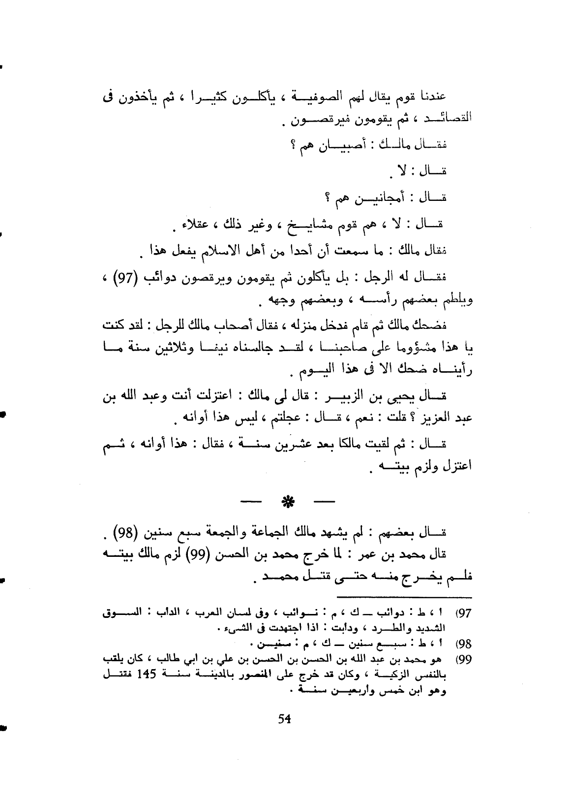 قال الرجل يل يأكلون ثم يقومون فيرقصون نوائب ويلطم بعضهم رأسه وبعضهم وجهه فضحك مالك ثم قام فدخل منزله.