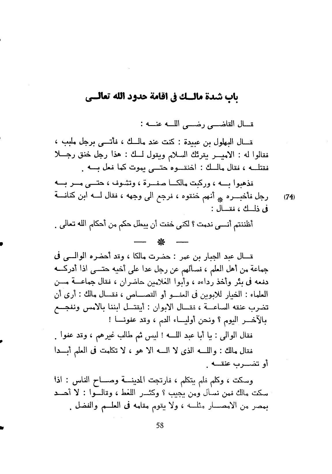 قال القاضي رضي الله تعالى عنه قال البهلول بن عبيدة كنت عند مالك فأتى برجل ملباً فقالوا له: الأمير يقرئك السلام ويقول لك هذا خنق رجلاً فقتله.