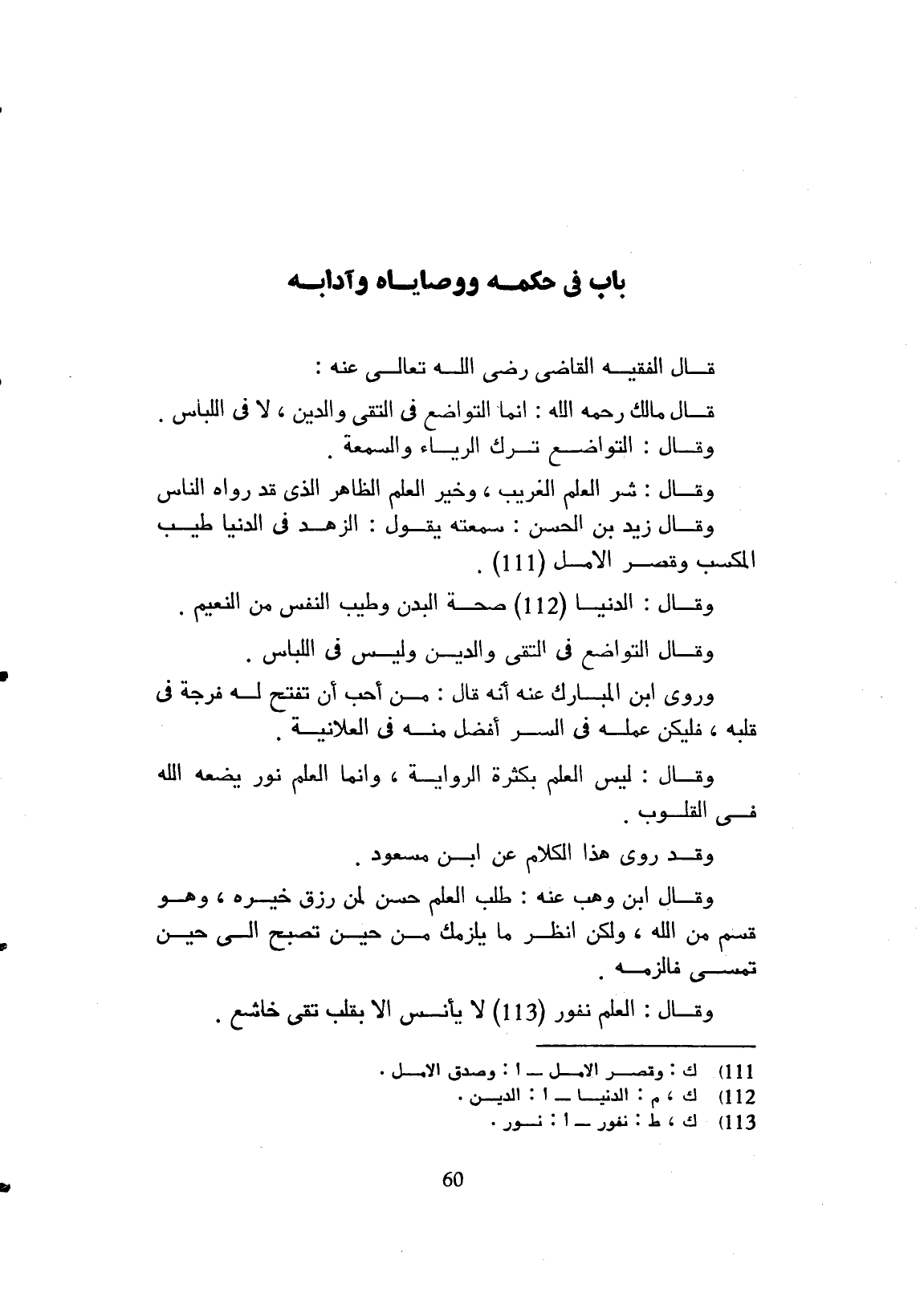 قال الفقيه القاضي رضي الله عنه قال مالك رحمه الله إنما التواضع في الدين والتقى لا في (كذا) قال التواضع ترك الرياء والسمعة.