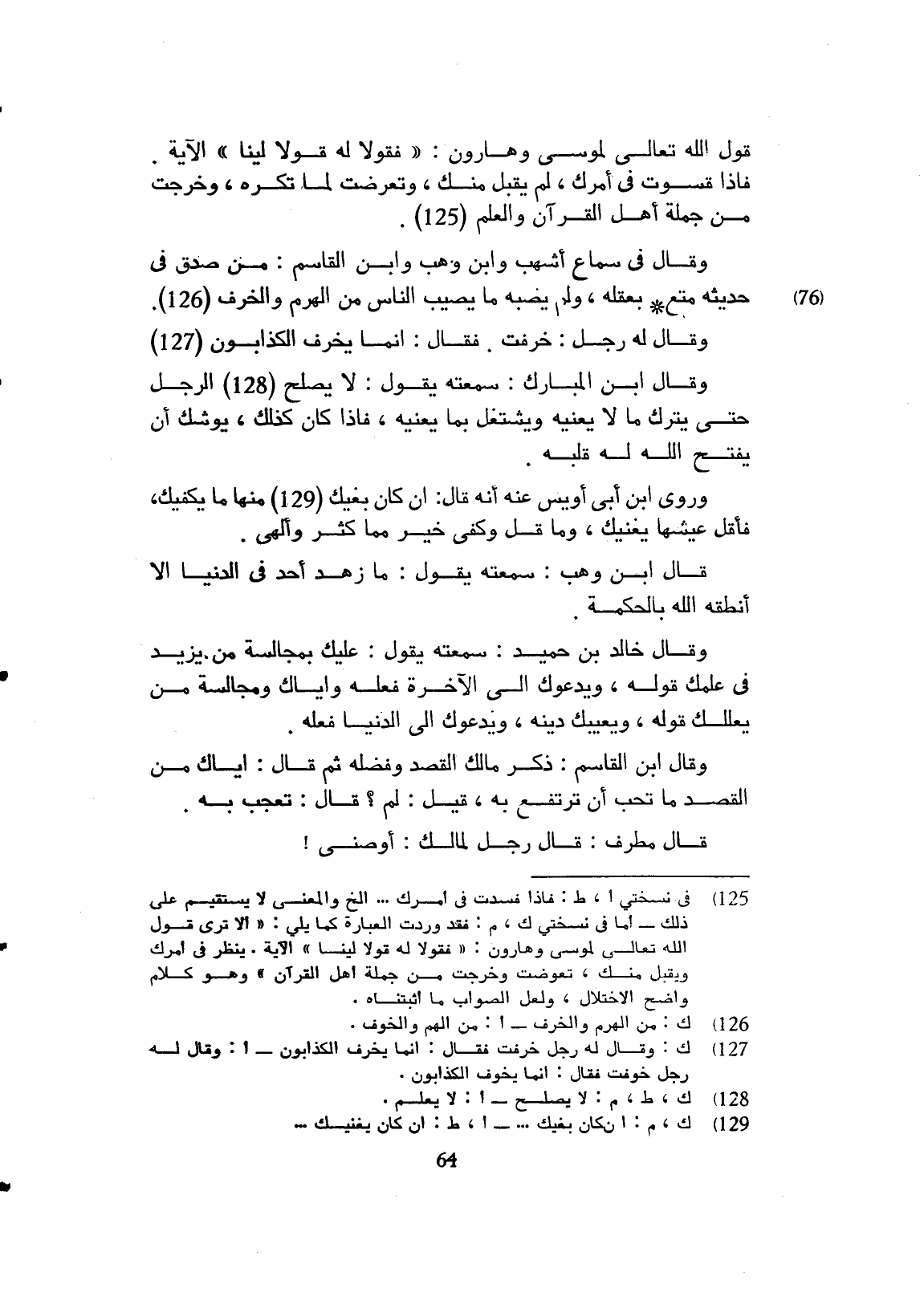 وروى ابن أبي أويس عنه أنه قال بغيتك منها ما يكفيك، فأقل عيشها يغنيك، وما قل وكفي خير مما أكثر وألهى.