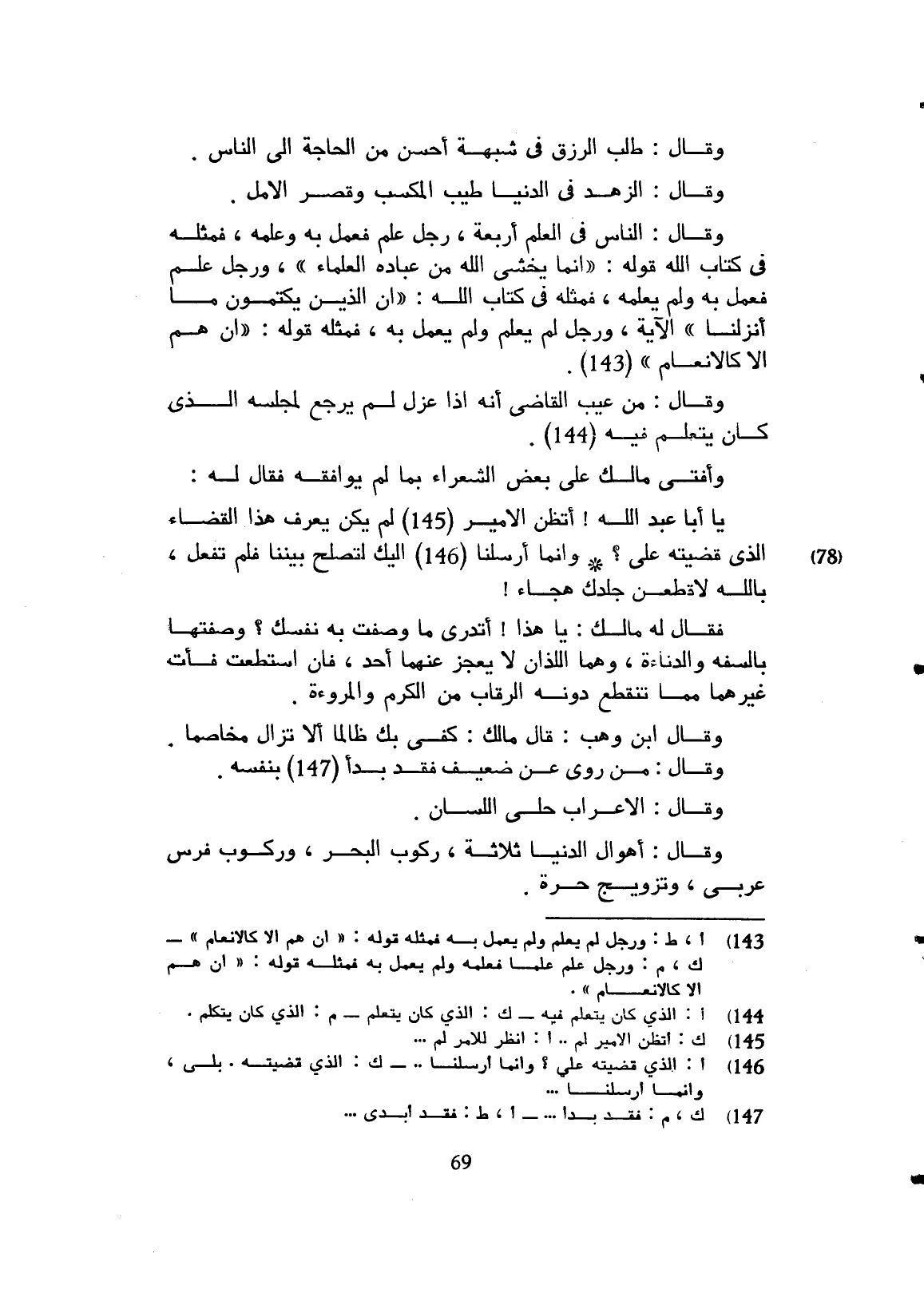 فقال له مالك يا هذا أتدري ما وصفت به نفسك؟ وصفتها بالسفه والدناءة وهما اللذان لا يعجز عنهما أحد فإن استطعت فأت غيرهما مما تنقطع دونه الرقاب من الكرم والمروءة.