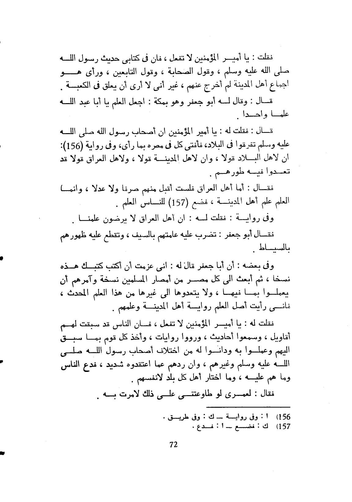 فقلت يا أمير المؤمنين لا تفعل فإن الناس قد سبقت لهم أقاويل وسمعوا أحاديث وروايات وأخذ كل قوم بما سبق إليهم وعملوا به ودالوا له من اختلاف أصحاب رسول الله صلى الله عليه وسلم وغيرهم وإن ردهم عما اعتقدوا شديد، فدع الناس وما هم عليه وما اختار أهل كل بلد لأنفسهم.