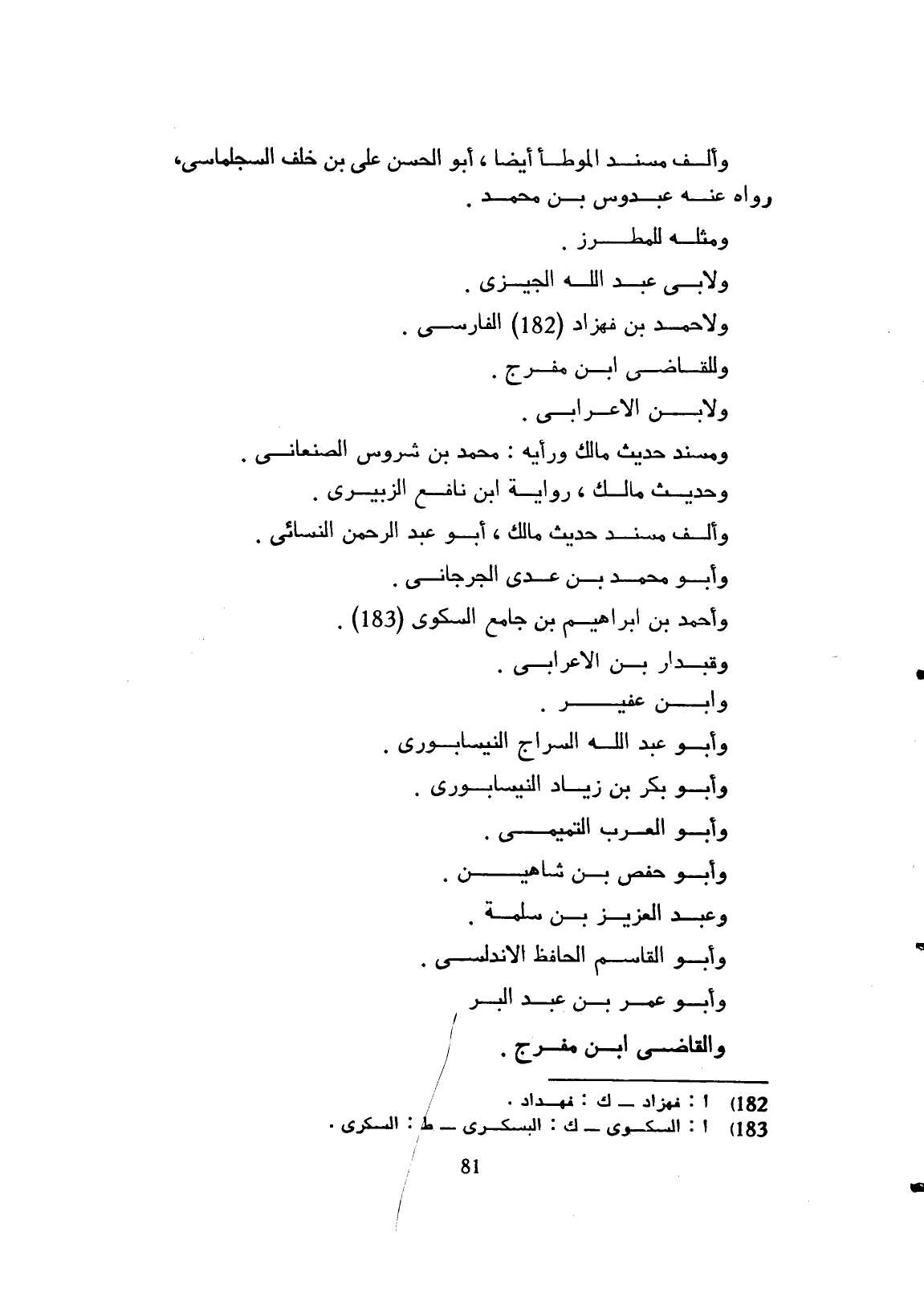 وألف مسند الموطأ أيضاً أبو الحسن علي بن خلف السجلماسي روى عنه عبدوس وأبو محمد ومثله للمطرز ولأبي عبيد الله الجيزي ولأحمد بن سدّاد الفارسي والقاضي ابن مفرّج ولابن الأعرابي ومسد حديث مالك رواية محمد بن شروس الصنعاني وحديث مالك رواية ابن نافع الزبيري وألف مسند حديث مالك أبو عبد الرحمان النسائي وأبو أحمد بن عدي الجرجاني، وأحمد بن إبراهيم بن جامع البكري وبندار وابن الأعرابي وابن عفير وأبو عبد الله السراج النيسابوري، وأبو بكر ابن زيد النيسابوري وأبو العرب التميمي وأبو حفص بن شاهين وعبد العزيز ابن سلمة وأبو القاسم الحافظ الأندلسي، وأبو عمر بن عبد البر، والقاضي ابن مفرج،