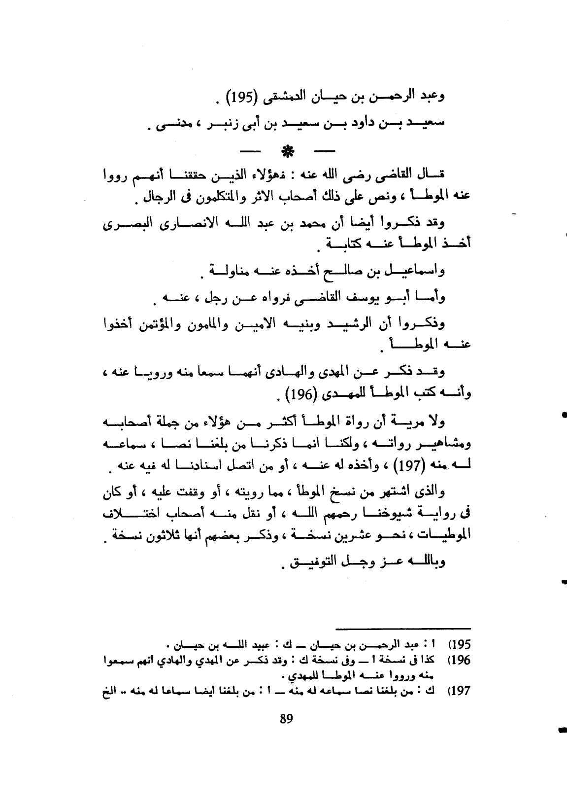 قال القاضي رضي الله تعالى عنه فهؤلاء الذين حققنا أنهم رووا عنه الموطأ ونص على ذلك أصحاب الأثر والمتكلمون في الرجال وقد ذكروا أيضاً أن محمد بن عبد الله الأنصاري البصري أخذ الموطأ عنه كتابة وإسماعيل ابن صالح أخذه عنه مناولة وأما أبو يوسف القاضي فرواه عن رجل عنه، وذكروا أن الرشيد وبنوه الأمين والمأمون والمؤتمن أخذوا عنه الموطأ وقد ذكر عن المهدي والهادي أنهما سمعا منه ورويا عنه، وأنه كتب الموطأ للمهدي ولا مرية إن رواة الموطأ من هؤلاء من جلة أصحابه ومشاهير رواته ولكن إنما ذكرنا من بلغنا نصاً سماعه له منه وأخذه له عنه، أو من اتصل إسنادنا له فيه عنه، والذي اشتهر من نسخ الموطأ مما رويته أو وقفت عليه أو كان في روايات شيوخنا رحمهم الله أو نقل منه أصحاب اختلاف الموطئات نحو عشرين نسخة وذكر بعضهم أنها ثلاثون نسخة وبالله التوفيق.