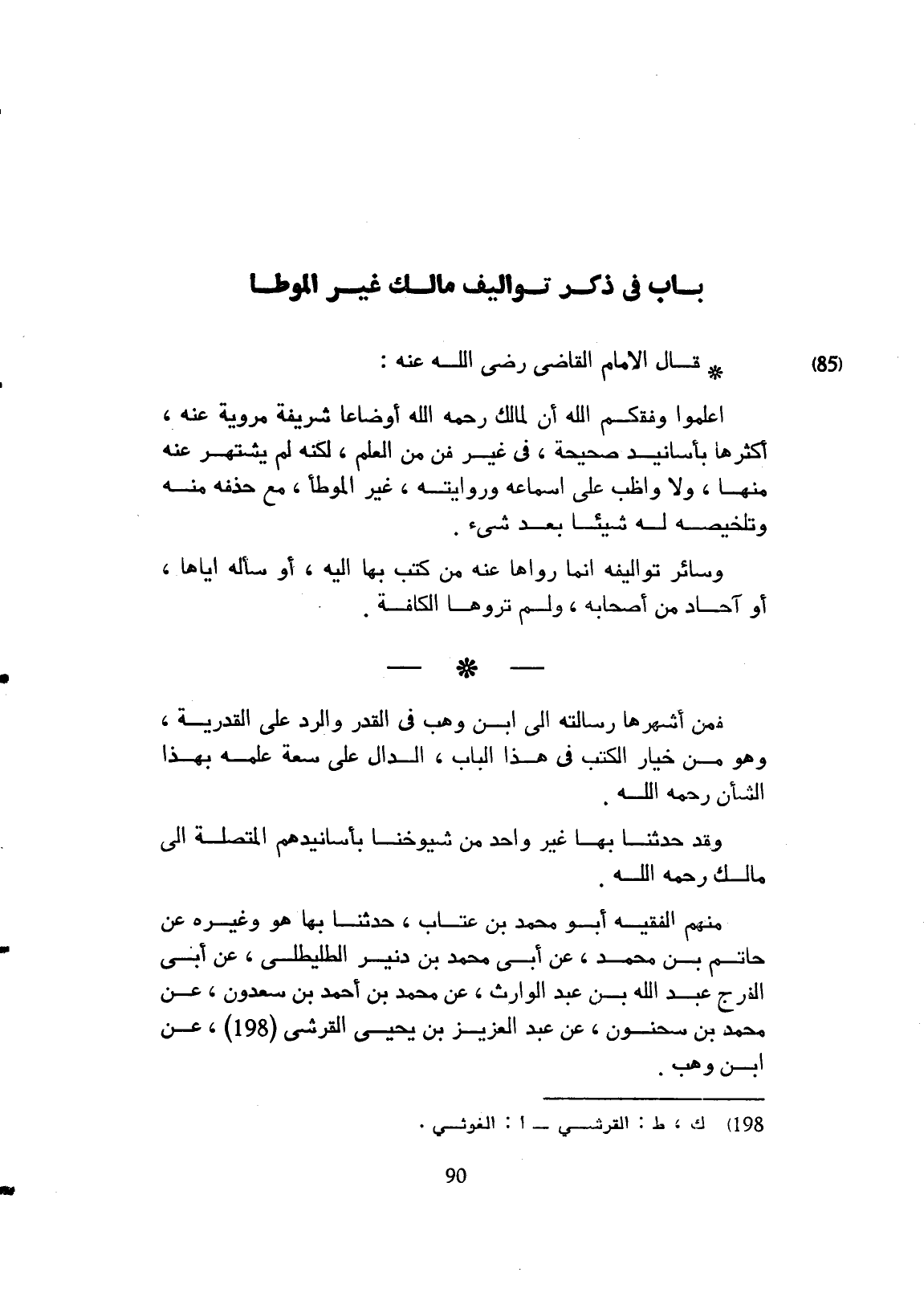 قال القاضي الإمام رضي الله تعالى عنه اعلموا وفقكم الله تعالى أن لمالك رحمه الله تعالى أوضاعاً شريفة مروية عنه، أكثرها بأسانيد صحيحة في غير فن من العلم، لكنه لم يشتهر عنه منها ولا واظب على إسماعه وروايته غير الموطأ حذفه منه وتلخيصه له شيئاً بعد شيء وسائر تأليفه، إنما رواها عنه من كتب بها إليه أو سأله إياها أحد من أصحابه ولم تروها الكافة فمن أشهرها رسالته إلى ابن وهب في القدر والرد على القدرية وهو من خيار الكتب في هذا الباب الدالة على سعة علمه بهذا الشأن رحمه الله وقد حدثنا بها غير واحد من شيوخنا بأسانيدهم المتصلة إلى مالك رحمه الله تعالى، منهم الفقيه أبو محمد بن عتاب حدثنا بها هو وغيره عن حاتم بن محمد عن أبي محمد ابن دنير الطليطلي، عن أبي الفرج عبد الله بن عبد الله الوارث عن محمد بن أحمد ابن سعدون، عن محمد بن سحنون، عن عبد العزيز بن يحيى القرشي، عن ابن وهب