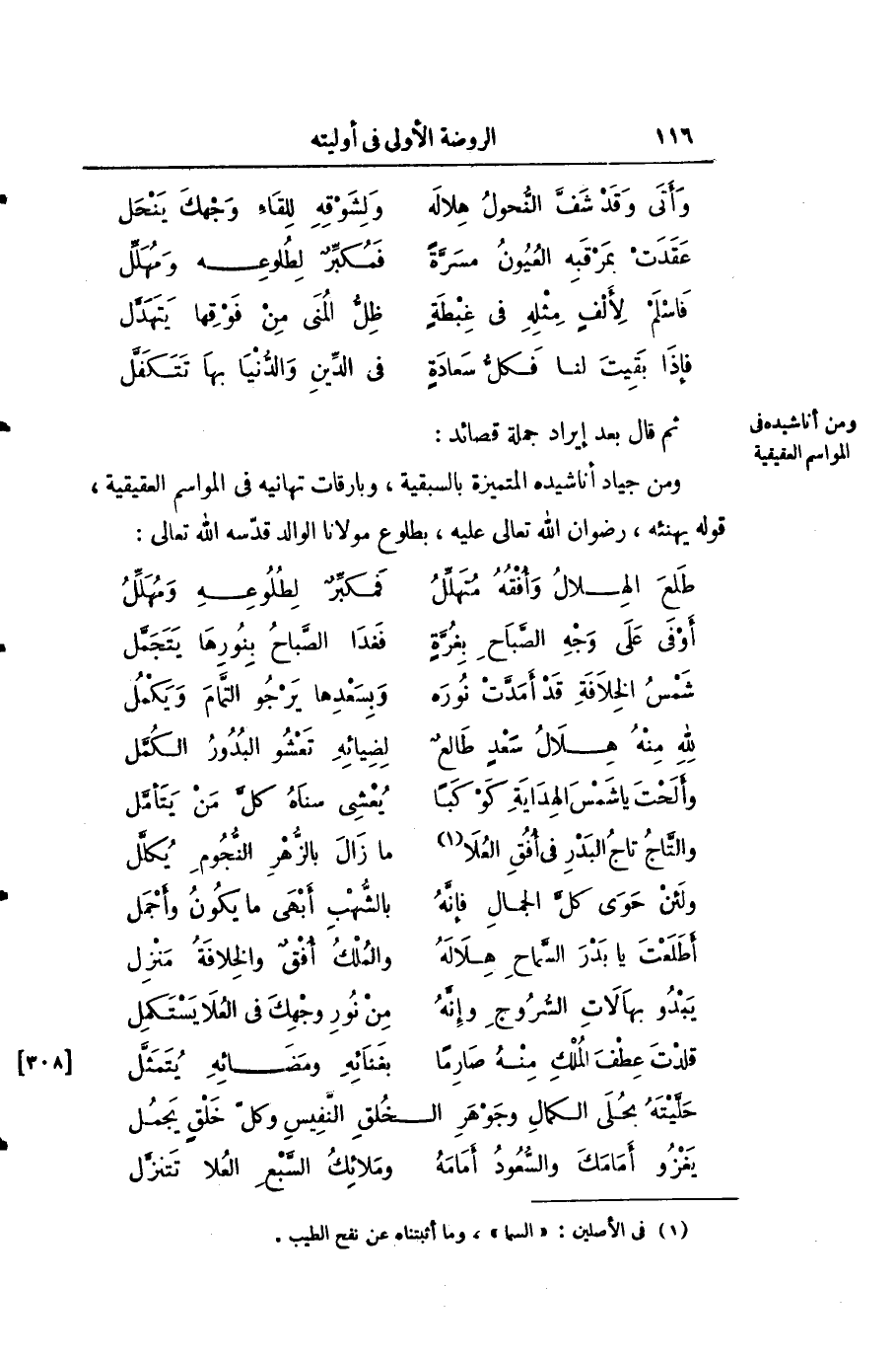 ثم قال بعد إراد جملة قصائد: ومن جياد أناشيده المتميزة بالسبقية، وبارقات تهانيه في المواسم العقيقية، قوله يهنئه، رضوان الله تعالى عليه، بطلوع مولانا الوالد قدسه الله تعالى:
