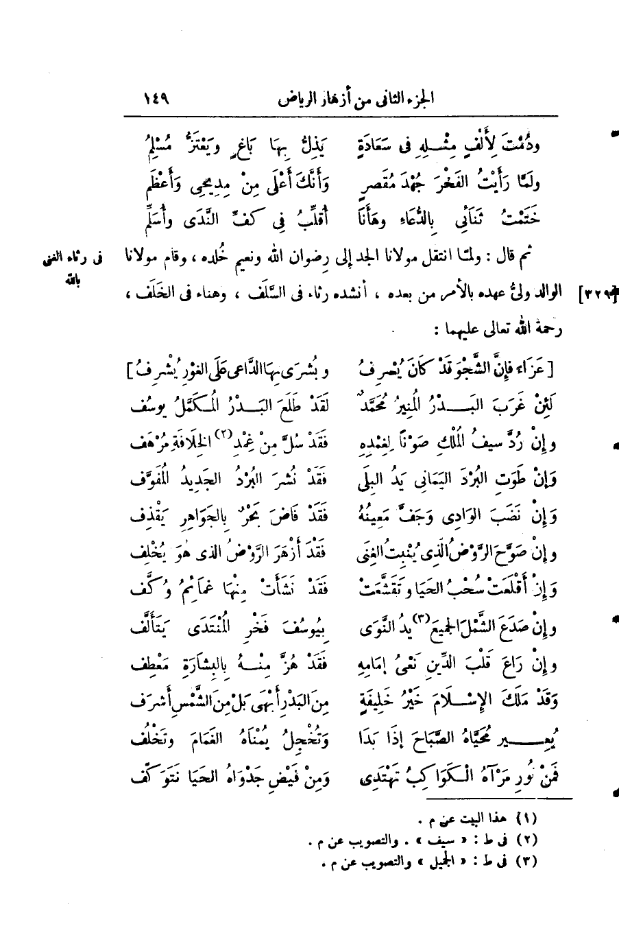 ثم قال: ولمّا أنتقل مولانا الجد إلى رضوان الله ونعيم خلده، وقام مولانا الوالد ولي عهده بالأمر من بعده، وانشد رثاء في السلف، وهناء في الخلف، رحمه الله تعالى عليهما: