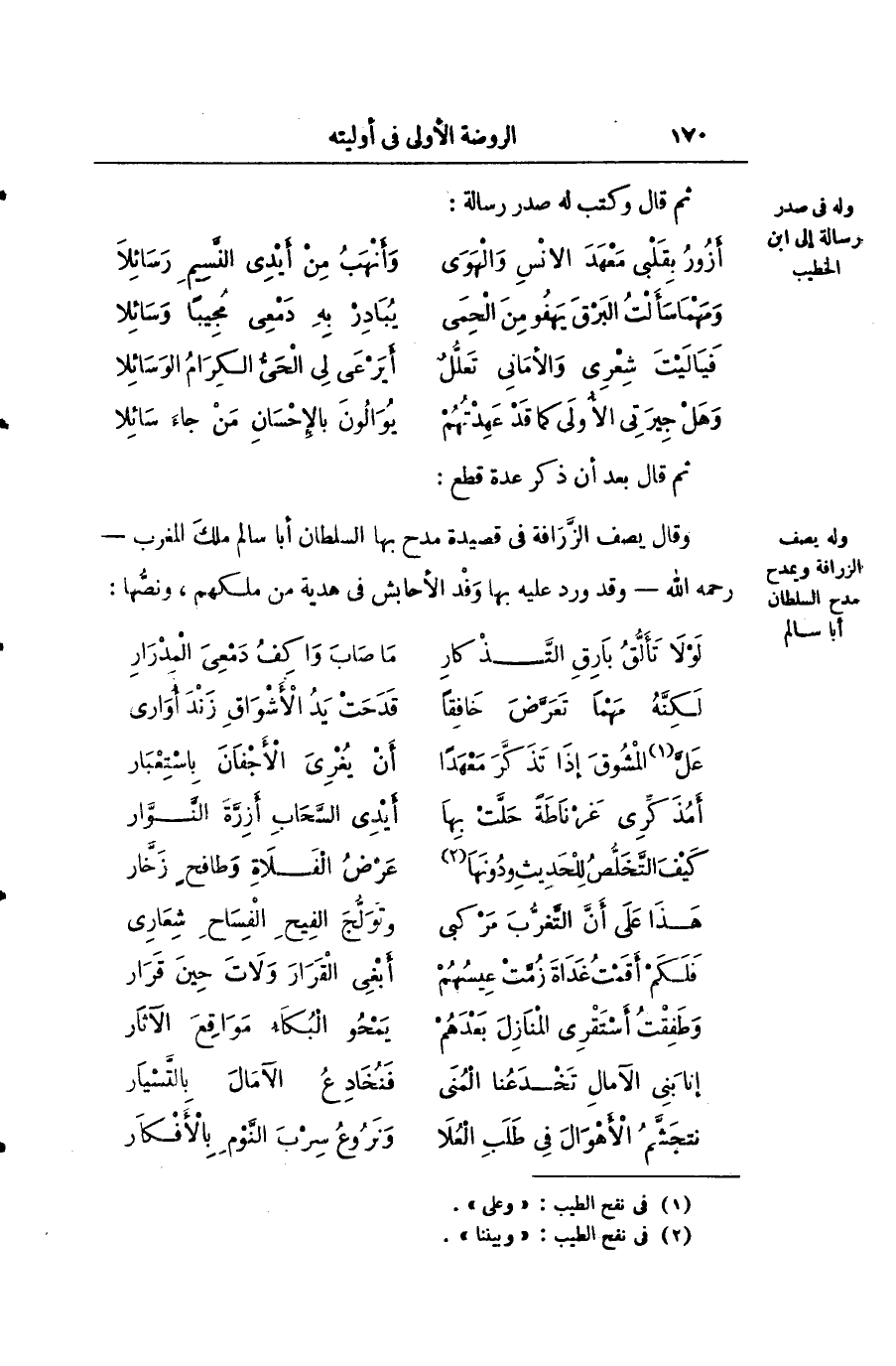 ثم قال بعد أن ذكر عدة قطع: وقال يصف الزرافة في قصيدة مدح بها السلطان أبا سالم ملك المغرب - رحمه الله - وقد ورد عليه بها وفد الأحابش في هدية من ملكهم، ونصها: