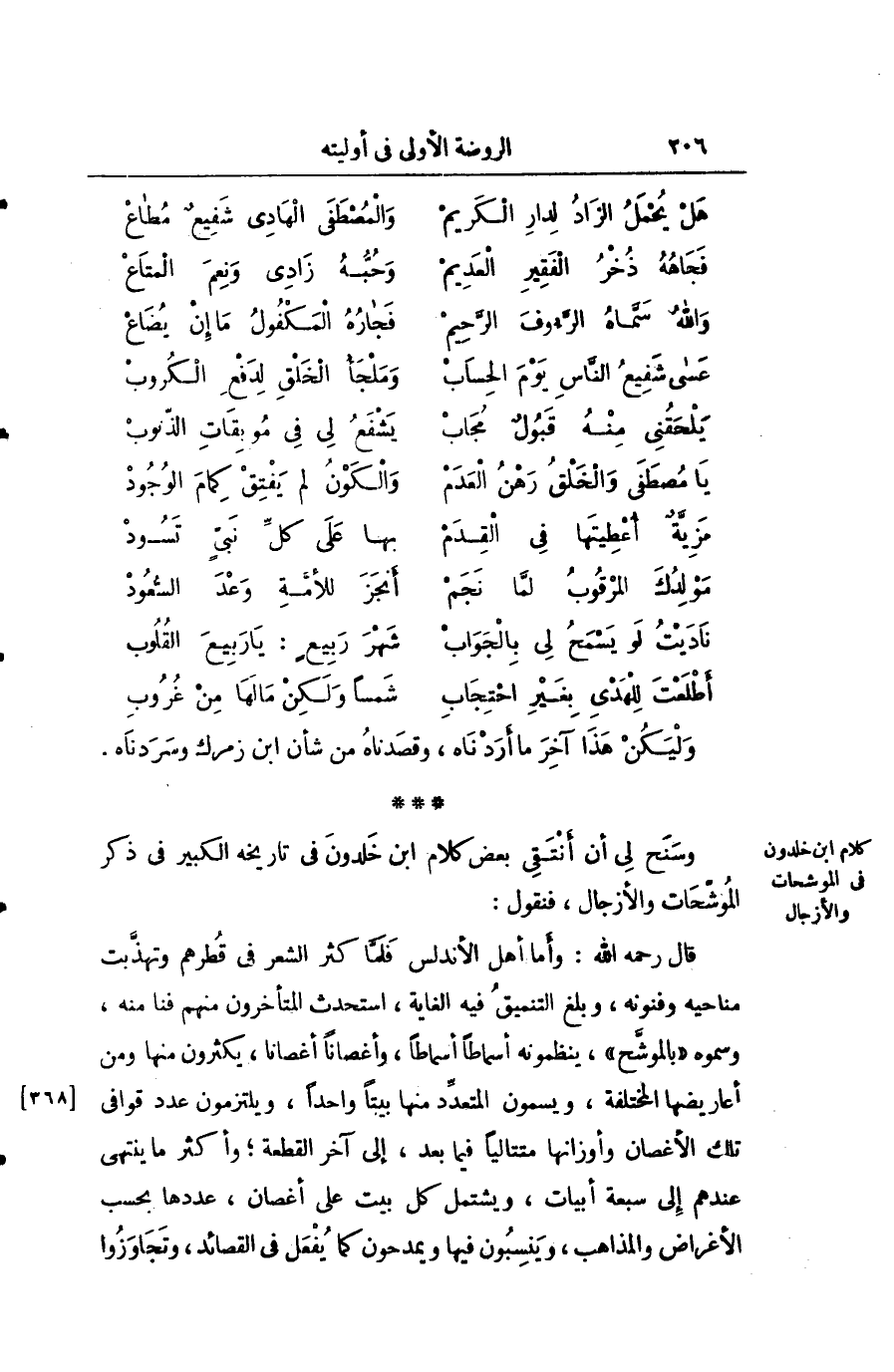وسنح لي أن أنتقي بعض كلام أبن خلدون في تاريخه الكبير في ذكر الموشحات والأزجال فنقول: قال رحمه الله: وأما أهل الأندلس فلما كثر الشعر في قطرهم وتهذبت مناحيه وفعوله وبلغ التعميق فيه الغاية استحدث المتأخرون منهم فنا منه وسموه بالموشح ينظمونه أسماطا أسماطا وأغصانا أغصانا يكثرون منها ومن أعاريضها المختلفة ويسمون منا بيتا واحدا ويلتزمون عدد قوافي تلك الأغصان وأوزانها متتالية فيما بعد إلى آخر القطعة وأكثر ما ينتهى عندهم إلى سبعة أبيات ويشتمل كل بيت على أغصان عددها بحسب الأغراض والمذاهب وينسبون فيها ويمدحون كما يفعل في القصائد وتجاوزوا