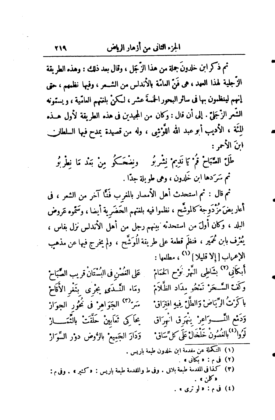 ثم ذكر أبن خلدون جملة من هذا الزجل وقال بعد ذلك: وهذه الطريقة الزجلية لهذا العهد هي فن العامة بالأندلس من الشعر وفيها نظمهم حتى إنهم لينظمون بها في سائر البحور الخمسة عشر لكن بلغتهم العمامية ويسمونه الشعر الزجلي. إلى أن قال: وكان من المجيدين في هذه الطريقة لأول هذه المئة الأديب أبو عبد الله اللوشي وله من قصيدة يمدح فيها السلطان أبن الأحمر: