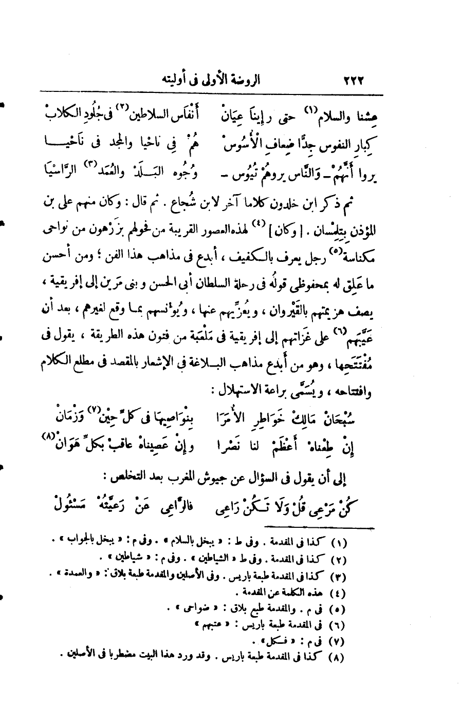 ثم ذكر أبن خلددون كلاما آخر لابن شجاع. ثم قال: وكان منهم على بن الؤذن بتلمستان. وكان لهذه العصور القريبة من فحولهم بزرهون من نواحي مكانسة رجل يعرف بالكفيف أبدع في مذاهب هذا الفن ومن أحسن ما علق له بمحفوظي قوله رحلة السلطان أبي الحسن بني مرين إلى أفريقية يصف هزيمتهم بالقيروان ويعزيهم عنها ويؤنسهم بما وقع لغيرهم بعد أن عيبهم على غزاتهم إلى أفريقية في ملعبة من فنون هذه الطريقة يقول في مفتتحها وهو من أبدع مذاهب البلاغة في الإشعار بالمقصد في مطلع الكلام وافتتاحه ويسمى براعة الاستهلال: