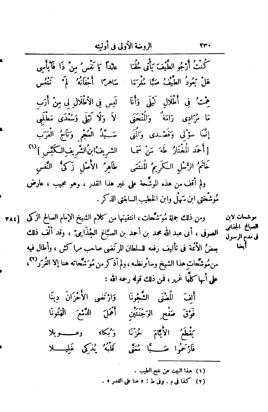 ومن ذلك جملة موشحات أنتقيتها من كلام الشيخ الإمام الصالح الزكي الصوفي أبي عبد الله محمّد بن أحمد بن الصباغ الجذامي وقد ألف ذلك بعض الأئمة في تأليف رفعه للسلطان المرتضى صاحب مراكش وأطال فيه من موشحات هذا الشيخ وسائر نظمه ولم أذكر من موشحاته إلاّ الغرر على أنها كلها غرر فمن ذلك قوله رحمه الله: