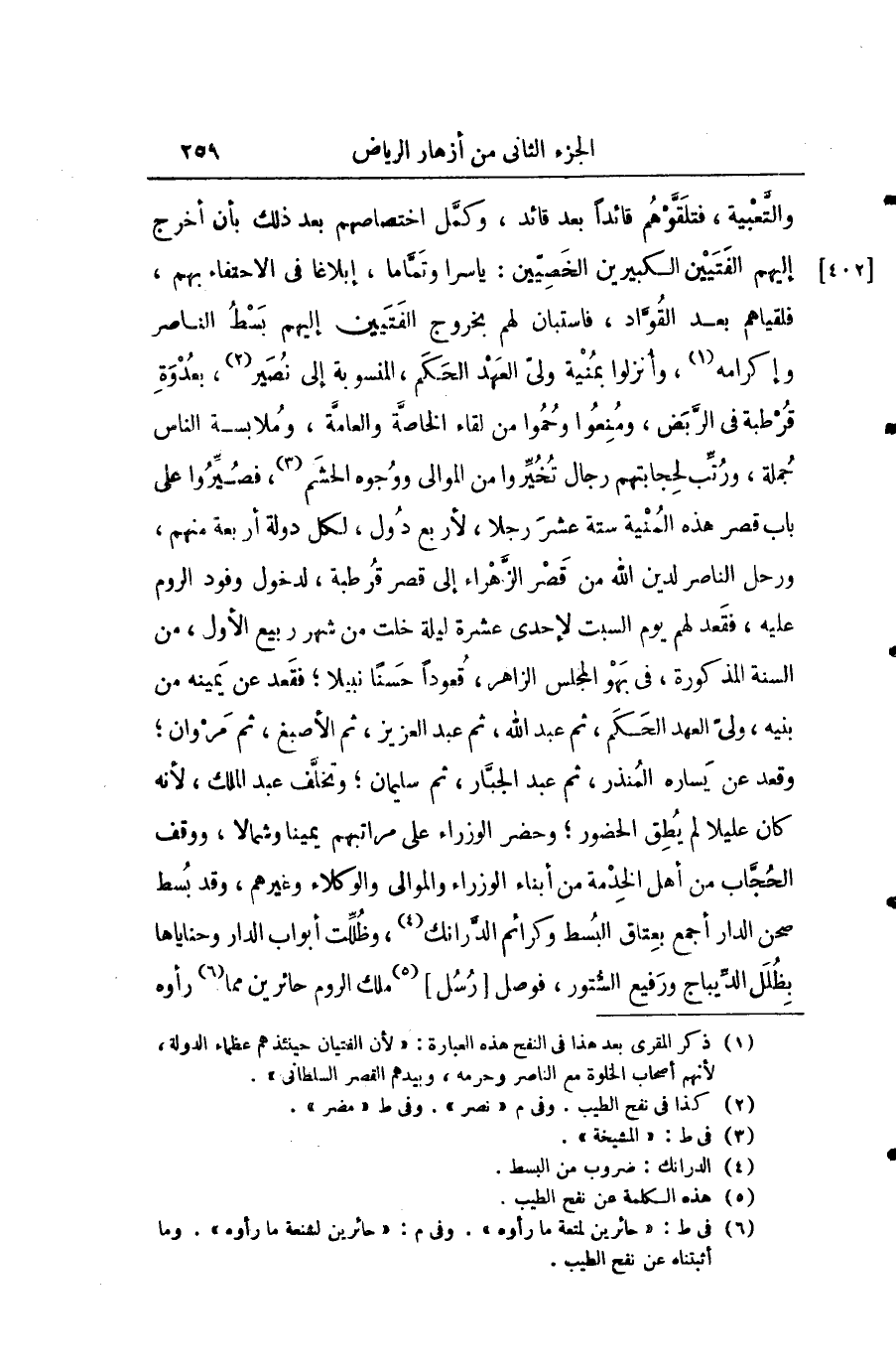 والتبعية فتلقوهم قائدا بعد قائد وكمل اختصاصهم بعد ذلك بأن أخرج إليهم الفتيين الكبيرين الخصيين ياسرا وتماما إبلاغا في الاحتفاء بهم فلقياهم بعد القواد فاستبان لهم بخروج الفتيين إليهم بسط الناصر وإكرامه وأنزلوا بمنية ولي العهد الحكم المنسوبة إلى نصير بعدوة قرطبة في الربض ومنعوا وحموا من لقاء الخاصة والعامة وملابسة الناس جملة ورتب لحاجتهم رجال تخيروا من الموالي ووجه الحشم فصيروا على باب قصر هذه المنية ستّة عشر رجلاً لأربع دول لكل دولة أربعة منهم ورحل الناصر لدين الله من قصر الزهراء إلى قصر قرطبة لدخول وفود الروم عليه فقعد لهم يوم السبت لإحدى عشرة ليلة خلت من شهر ربيع الأول من السنة المذكورة في بهو المجلس الزاهر فقعودا حسنا نبيلا فقعد عن يمينه من بنيه ولي العهد الحكم ثم عبد الله ثم عبد العزيز ثم الأصبغ ثم مروان وقعد عن يساره المنذر ثم عبد الجبار ثم سلمان وتخلف عبد الملك لأنه كان عليلا لم يطق الحضور وحضر الوزراء على مراتبهم يمينا وشمالا ووقف الحجاب من أهل الخدمة من أبناء الوزراء والموالي والوكلاء وغيرهم وقد بسط صحن الدار أجمع بعتاق البسط وكرائم الدرانك وظللت أبواب الدار وحناياها بظلل الديباج ورفيع السور فوصل رسل ملك الروم حائرين مما رأوه
