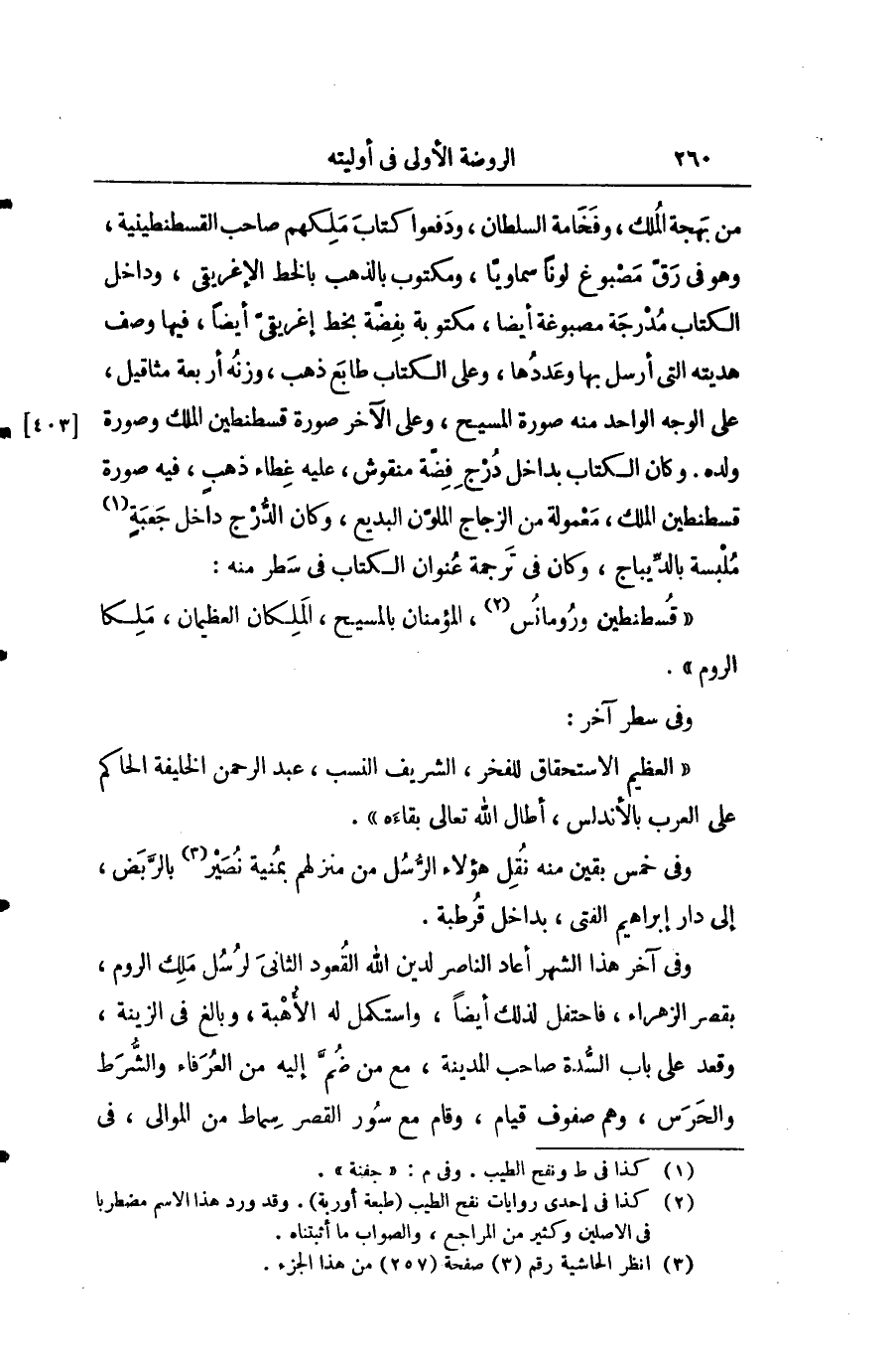من بهجة الملك وفخامة السلطان ودفعوا كتاب ملكهم صاحب القسطنطينية وهو في رق مصبوغ لونا سماويا ومكتوب بالذهب بالخط الإغريقي وداخل الكتاب مدرجة مصبوغة اياضا مكتوب بفضة بخط إغريقي أيضاً فيها وصف هديته التي أرسل بها وعددها وعلى الكتاب طابع ذهب وزنه أربعة مثاقيل على الوجه الواحد منه صورة المسيح وعلى الآخر صورة قسطنطين الملك وصورة ولده. وكان الكتاب بداخل درج فضة منقوش عليه غطاء ذهب فيه صورة قسطنطين الملك معمولة من الزجاج الملون البديع وكان الدرج داخل جعبة ملبسو بالديباج وكان في ترجمة عنوان الكتاب في سطر منه: " قسطنطين ورومانس المؤمن بالمسيح الملكان العظيمان ملكا الروم ".