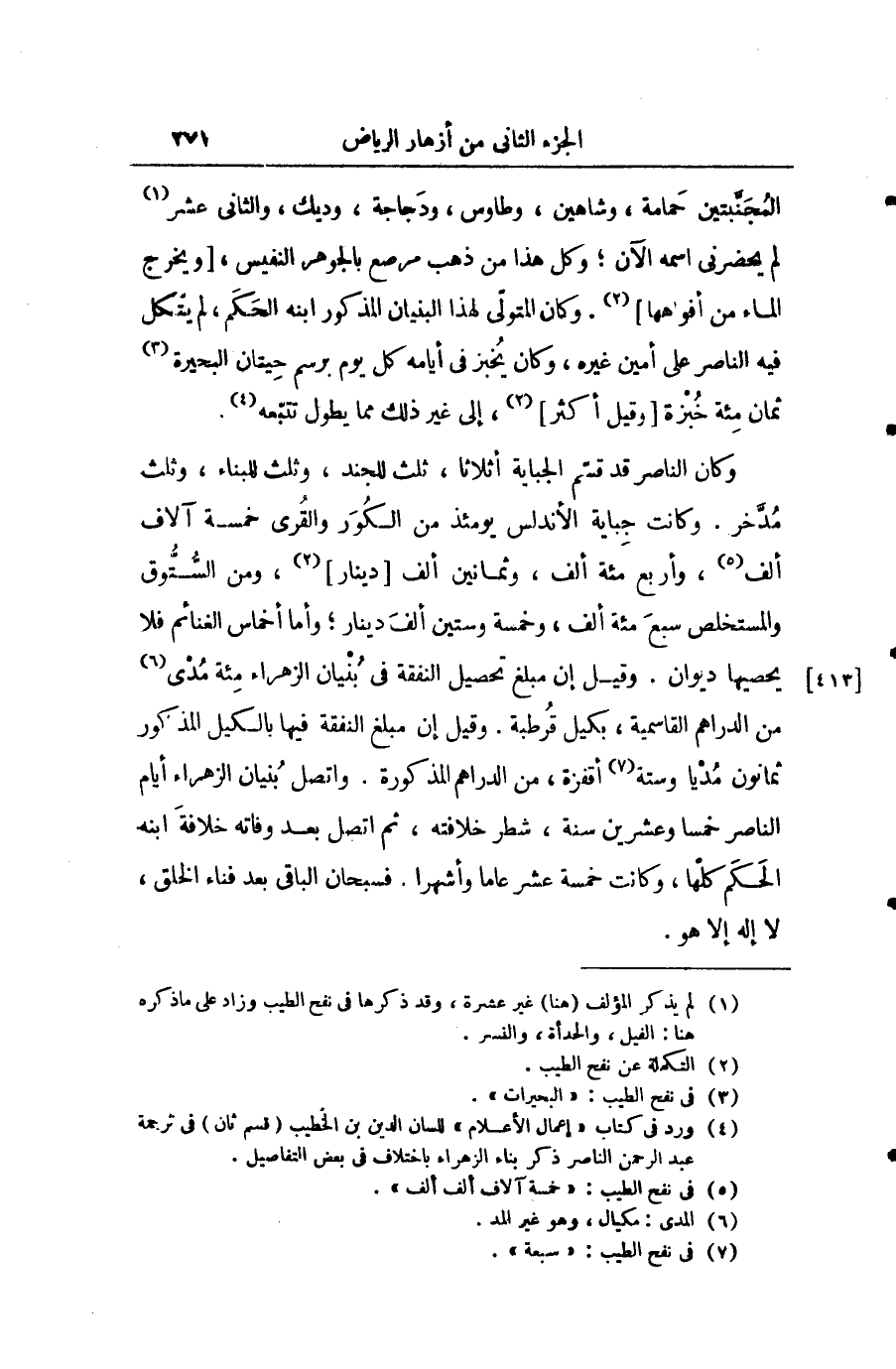 وكان الناصر قد قسم الجباية أثلاثاً، ثلث للجند وثلث للبناء، وثلث مدخر. وكانت جباية الأندلس يومئذ من الكور والقرى خمسة آلاف ألف، وأربع مائة ألف، وثمانين ألف دينار، ومن الستوق والمستخلص سبع مائة وألف، وخمسة وستين ألف دينار، وأما أخماس الغنائم فلا يحصيها ديوان. وقيل إنَّ مبلغ تحصيل النفقة في بنيان الزهراء مائة مدى من الدراهم القاسمية، بكيل قرطبة. وقيل إنَّ مبلغ النفقة فيها بالكيل المذكور ثمانون مديا وستّة أقفزة، من الدراهم المذكورة. واتصل بناء الزهراء أيام الناصر خمساً وعشرين سنة، شطر خلافته، ثم اتصل بعد وفاته خلافة ابنه الحكم كلها، وكانت خمسة عشر عاما وأشهراً. فسبحان الباقي بعد فناء الخلق، لا اله إلاّ هو.