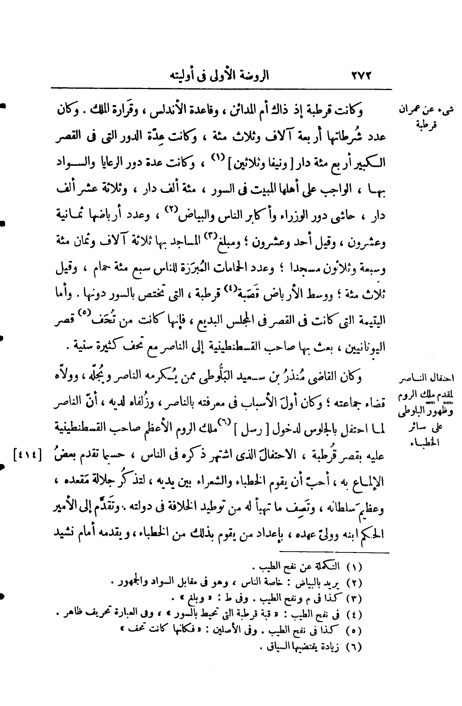 وكانت قرطبة إذ ذاك أم المدائن، وقاعدة الأندلس، وقرارة الملك، وكان عدد شرطاتها أربعة آلاف وثلاثة مائة، وكانت عدة الدور التي في القصر الكبير أربع مائة دار ونفيا وثلاثين، وكانت عدة دور الرعايا والسواد بها، والواجب على أهل المبيت في السور، مائة ألف دار، وثلاثة عشر ألف دار، حاشى دور الوزراء وأكابر الناس والبياض، وعدد أرباضها ثمانية وعشرون، وقيل أحد وعشرون؛ ومبلغ المساجد بها ثلاثة آلاف وثمان مائة وسبعة وثلاثون مسجداً؛ وعدد حمامات المبرزة للناس سبع مائة حمام، وقيل ثلاث مائة؛ ووسط الأرباض قصبة قرطبة، التي تختص بالسور دونها. وأما اليتيمة التي كانت في القص في المجلس البديع؛ فإنها كانت من تحف قصر اليونانيين، بعث بها صاحب القسطنطينية إلى الناصر مع تحف كثيرة سنية. وكان القاضي منذر بن سعيد البلوطي ممن يكرمه الناصر ويجله، وولاه قضاء جماعته؛ وكان أوّل الأسباب في معرفته بالناصر، وزلفاه لديه، إنَّ الناصر لمّا احتفل بالجلوس لدخول رسل ملك الروم الأعظم صاحب القسطنطينية عليه بقصر قرطبة، الاحتفال الذي اشتهر ذكره في الناس، حسبما تقدم بعض الإلماع به، أحب أنَّ يفوم الخطباء والشعراء بين يديه، لتذكر جلالة مقعده، وعظيم سلطانه، وتصف ما تهيأ له من توطيد الخلافة في دولته. وتقدم إلى الأمير الحكم ابنه وولي عهده، بإعداد من يقوم بذلك من الخطباء، ويقدمه أمام نشيد