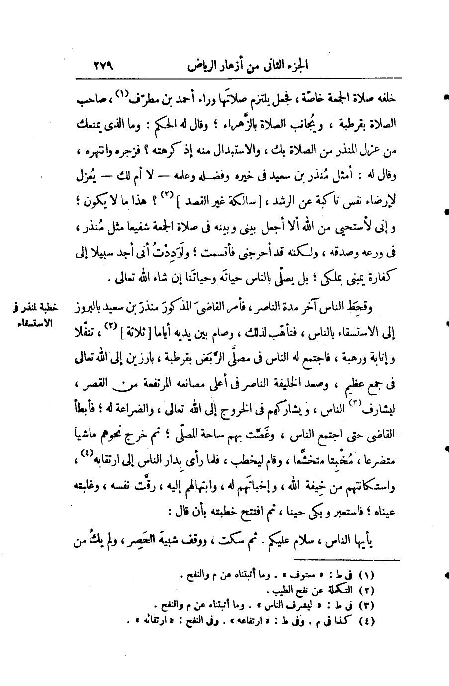 وقحط الناس آخر مدة الناصر فأمر القاضي المذكور منذر بن سعيد بالبروز إلى الاستسقاء بالناس فتأهب لذلك وصام بين يديه أياما ثلاثة تنفلا وإنابة ورهبة فاجتمع له الناس في مصلى الربض بقرطبة بارزين إلى الله تعالى في جمع عظيم وصعد الخليفة مصانعه المرتفعة من القصر ليشارف الناس ويشاركهم في الخروج إلى الله تعالى والضراعة له فأبطأ القاضي حتى اجتمع الناس وغصت بهم ساحة المصلى ثم خرج نحوهم ماشيا متضرعا مخبتا متخشعا وقام ليخط فلما رأى بدار الناس إلى ارتقابه واستكانتهم من خيفة الله وإخباتهم له وإبتهالهم إليه رقت نفسه وغلبته عيناه فاستعبر وبكى حينا ثم افتتح خطبته بأن قال: يا أيها الناس سلام عليكم ثم سكت ووقف شبيه الحصر ولم يك من