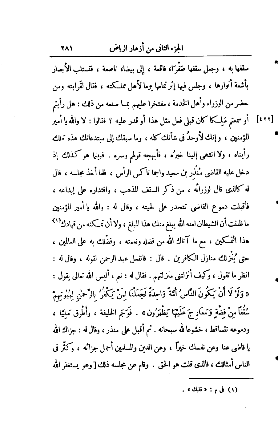سقفها به وجعل سقفها حمراء فاقعة إلى بيضاء ناصعة فتستلب الأبصار بأشعة أنوارها وجلس في إثر تمامها يوما لأهل مملكته فقال لقرابته ومن حضر من الوزراء وأهل الخدمة مفتخرا عليهم بما صنعه من ذلك: هل رأيتم أو سمعتم ملكا كان قبلي فعل مثل هذا أو قدر عليه؟ فقالوا: لا والله يا أمير المؤمنين وإنك لأوحد في شأنك كله وما سيبقك إلى مبتدعاتك هذه ملك رأيناه ولا انتهى إلينا خبره فأبهجه قولهم وسره. فبينما هو كذلك إذ دخل عليه القاضي منذر بن سعيد واجما ناكس الرأس فلما أخذ مجلسه قال له كالذي قال لوزرائه من ذكر السقف المذهب واقتداره على ابتداعه فأقبلت دموع القاضي تتحدر على لحيته وقال له: والله يا أمير المؤمنين ما ظننت أنَّ الشيطان لعنه الله يبلغ منك هذا المبلغ ولا أن تمكنه من قيادك هذا التمكين مع ما آتاك الله من فضله ونعمته وفضلك به على العالمين حتى ينزلك منازل الكافرين. قال: فانفعل عبد الرحمن لقوله وقال له: انظر ماذا تقول وكيف أنزلتني منزلتهم. فقال له: نعم أليس الله تعالى يقول: " ولولا أن يكون الناس أمة واحدة لجعلنا لمن يكفر بالرحمن لبيوتهم سقفا من فضة ومعارج عليها يظهرون ". فوجم الخليفة وأطرق مليا ودموعه تتساقط خشوعا لله سبحانه. ثم أقبل منذر وقال له: جزاك الله يا قاضي عنا وعن نفسك خيرا وعن الدين والمسلمين أجمل الجزاء وكثر في الناس أمثالك فالذي قلت هو الحق. وقام عن مجلسه ذلك وهو يستغفر الله