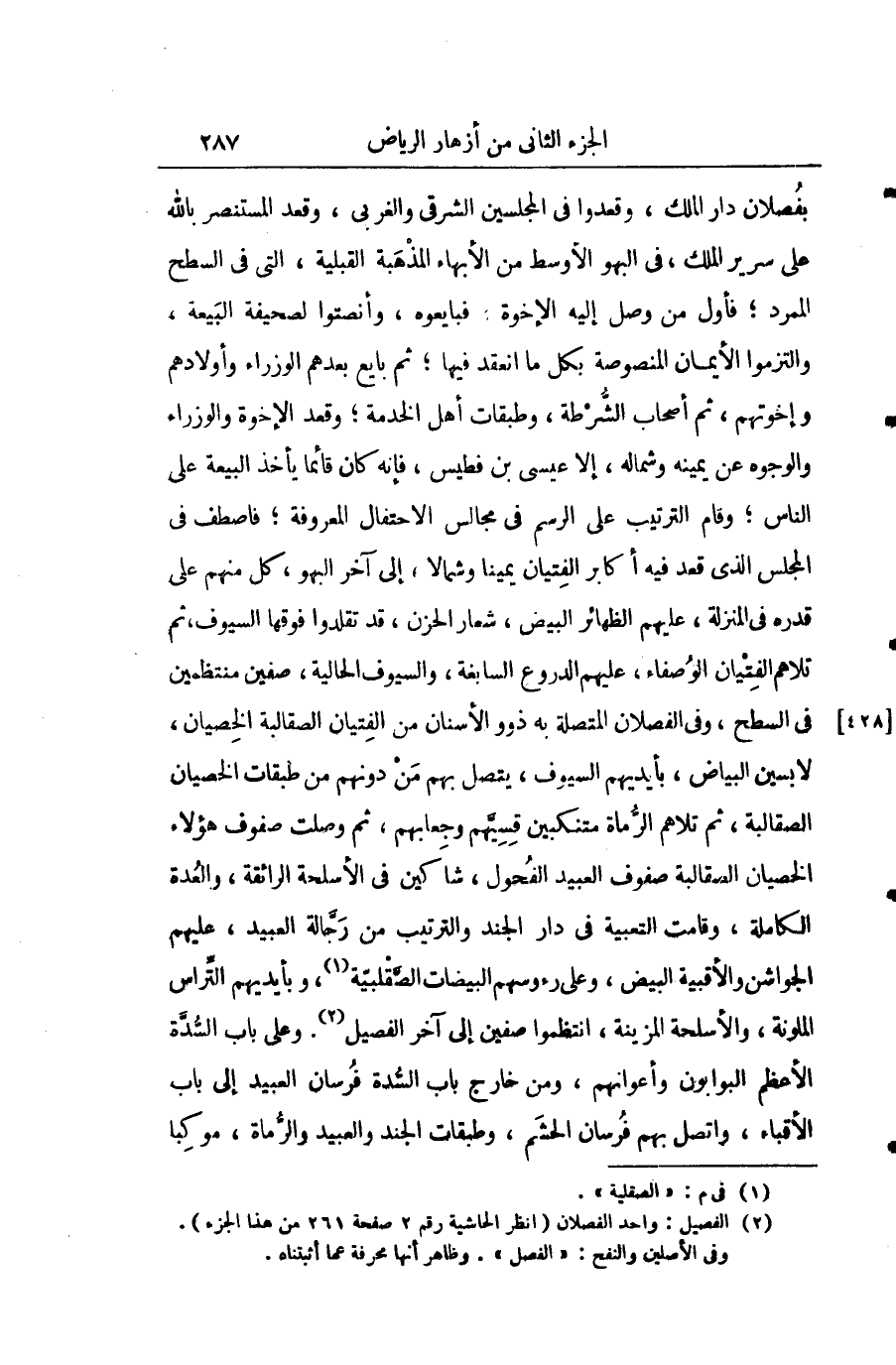 بفصلان دار الملك وقعدوا في المجلسين الشرقي والغربي وقعد المستنصر بالله على سرير الملك في البهو الأوسط من الأبهاء المذهبة القبلية التي في السطح الممرد فأول من وصل إليه الإخوة فبايعوه وأنصتوا لصحيفة البيعة والتزموا الأيمان المنصوصة بكل ما أنعقد فيها ثم بايع بعدهم الوزراء وأولادهم وإخوتهم ثم أصحاب الشرطة وطبقات أهل الخدمة وقعد الإخوة والوزراء والوجوه عن يمينه وشماله إلاّ عيسى بن فطيس فانه كان يأخذ البيعة على الناس وقام الترتيب على الرسم في مجالس الاحتفال المعروفة فاصطاف في المجلس الذي قعد فيه أكابر الفتيان يمينا وشمالا إلى آخر البهو كل منهم على قدره في المنزلة عليهم الظاهر البيض شعار الحزن قد تقلدوا فوقها السيوف ثم تلاهم الفتيان الوصفاء غليهم الدروع السابغة والسيوف الحالية صفين منتظمين في السطح وفي الفصلان المتصلة به ذوو الأسنان من الفتيان الصقالبة الخصيان لابس البياض بأيديهم السيوف يتصل بهم من دونهم من طبقات الخصيان الصقالبة ثم تلاهم الرماة متنكبين قسيهم وجعابهم ثم وصلت صفوف هؤلاء الخصيان الصقالبة صفوف العبيد الفحول شاكين في الأسلحة الرائقة والعدة الكاملة وقامت التعبية في دار الجند والترتيب من رجالة العبيد عليهم الجواشن والأقبية البيض وعلى رءوسهم البيضات الصقلية وبأيديهم التراس الملونة والأسلحة المزينة انتظموا صفين إلى آخر الفصيل. وعلى باب السدة الأعظم البوابون وأعوانهم ومن خارج باب السدة فرسان العبيد إلى باب الأقباء واتصل بهم فرسان الحشم وطبقات الجند والعبيد والرماة مواكبا