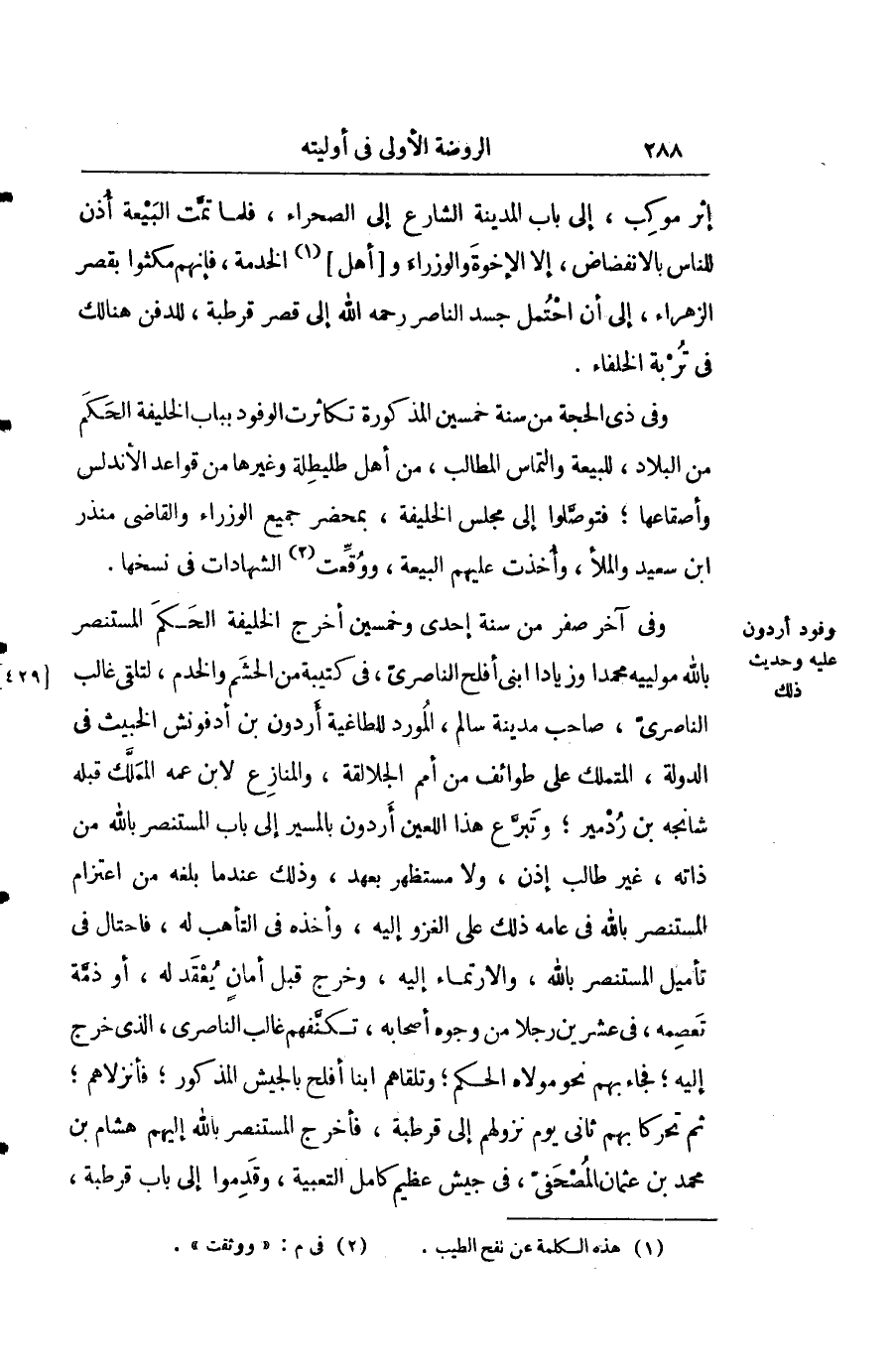 إثر مواكب إلى باب المدينة الشارع إلى الصحراء فلما تمت البيعة إذن للناس بالنفضاض إلاّ الإخوة والوزراء وأهل الخدمة فإنهم مكثوا بقصر الزهراء إلى أن احتمل جسد الناصر رحمه الله إلى قصر قرطبة للدفن هنالك في تربة الخلفاء.