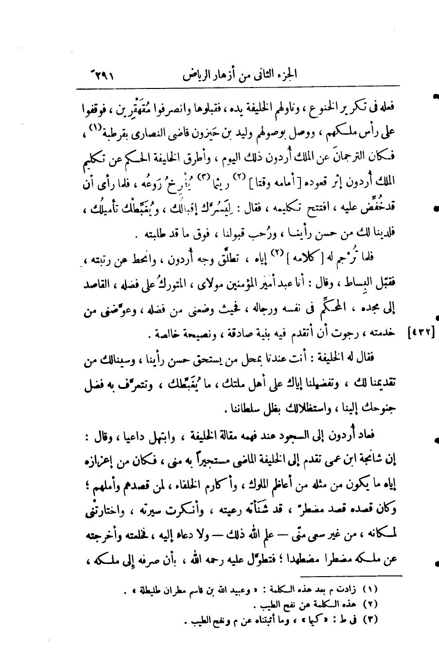 فلما ترجم له كلامه إياه تطلق وجه أردون وانحط عن رتبته فقبل البساط وقال: أنا عبد أمير المؤمنين مولاي المتورك على فضله القاصد إلى مجده المحكم في نفسه ورجاله فحيث وضعني من فضله وعوضني من خدمته رجوت أن أتقدم فيه بنية صادقة ونصيحة خالصة.